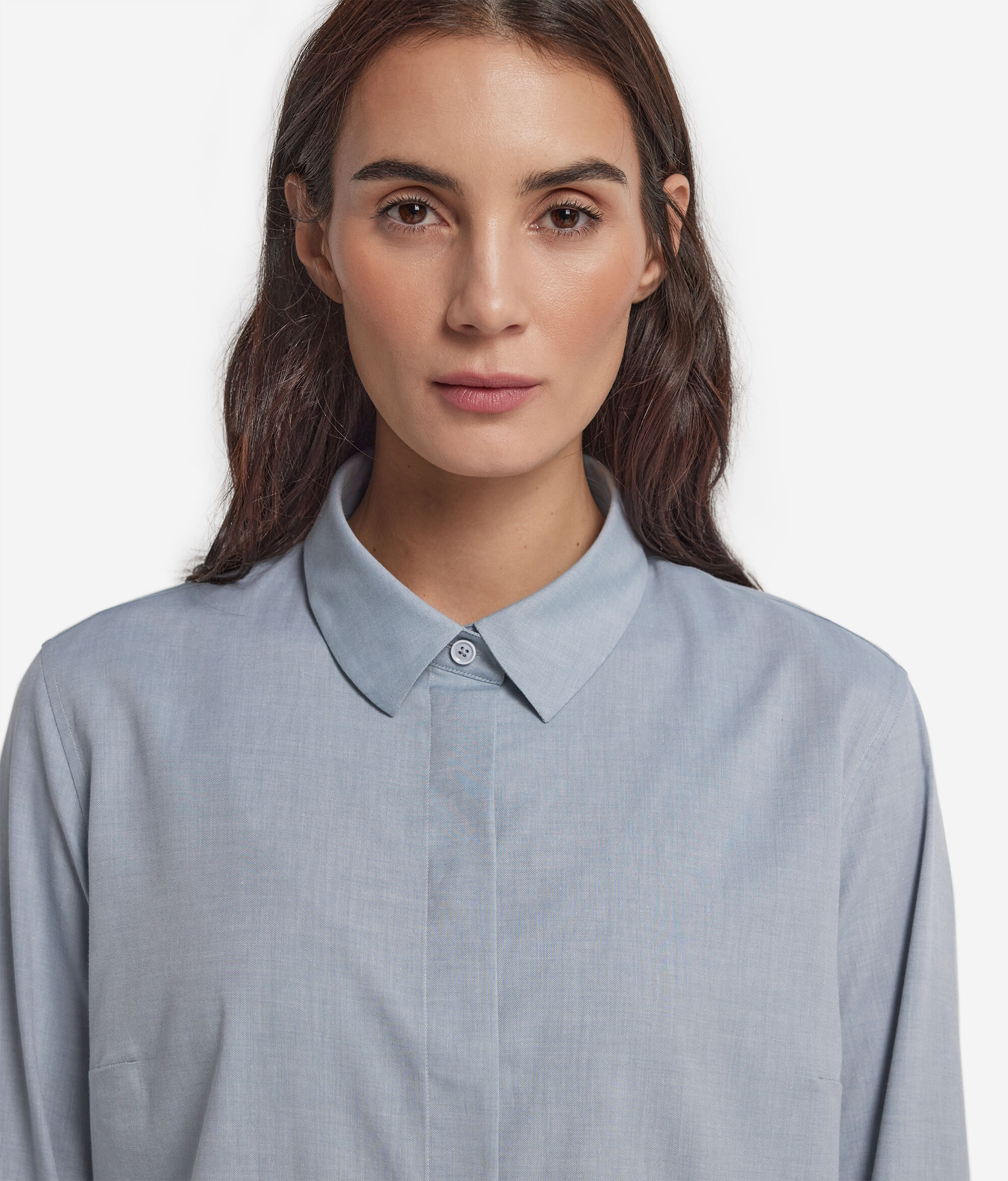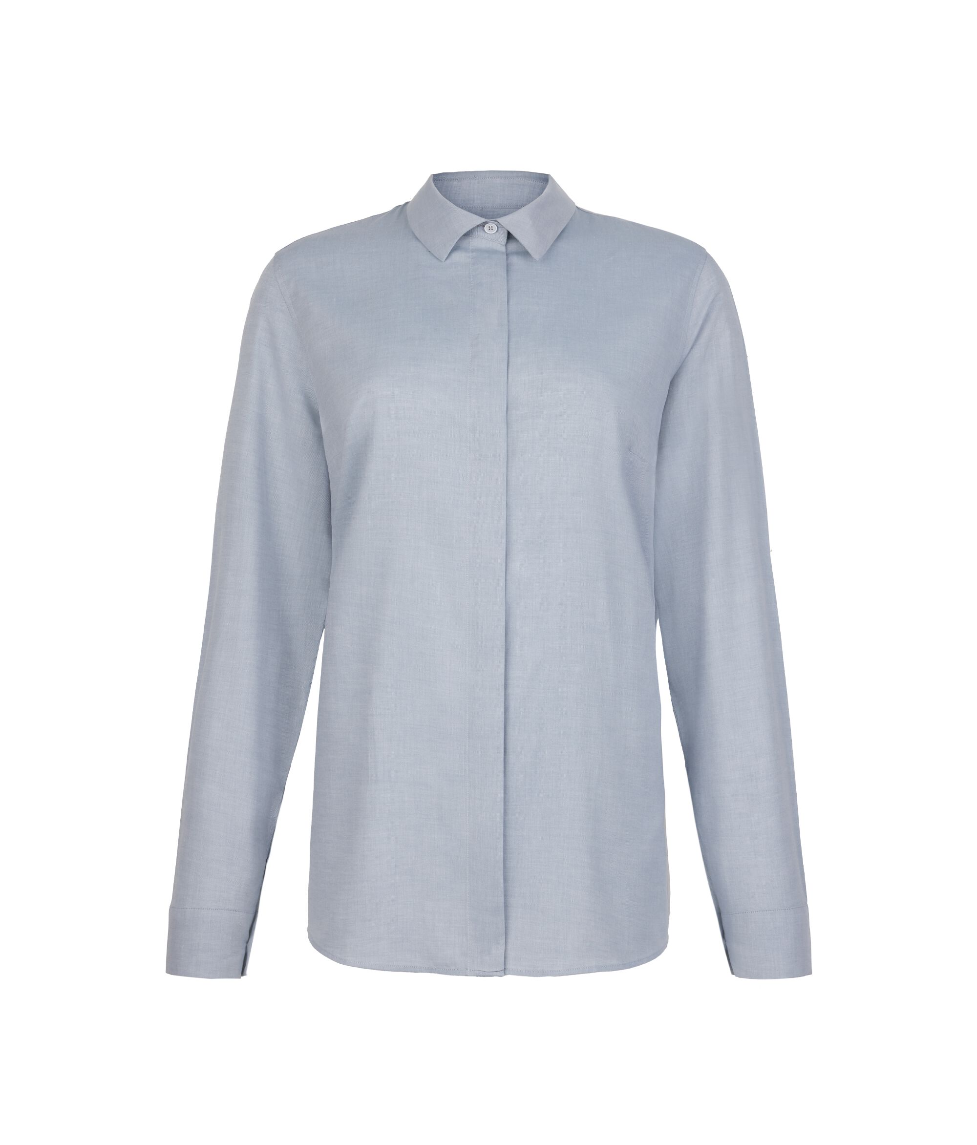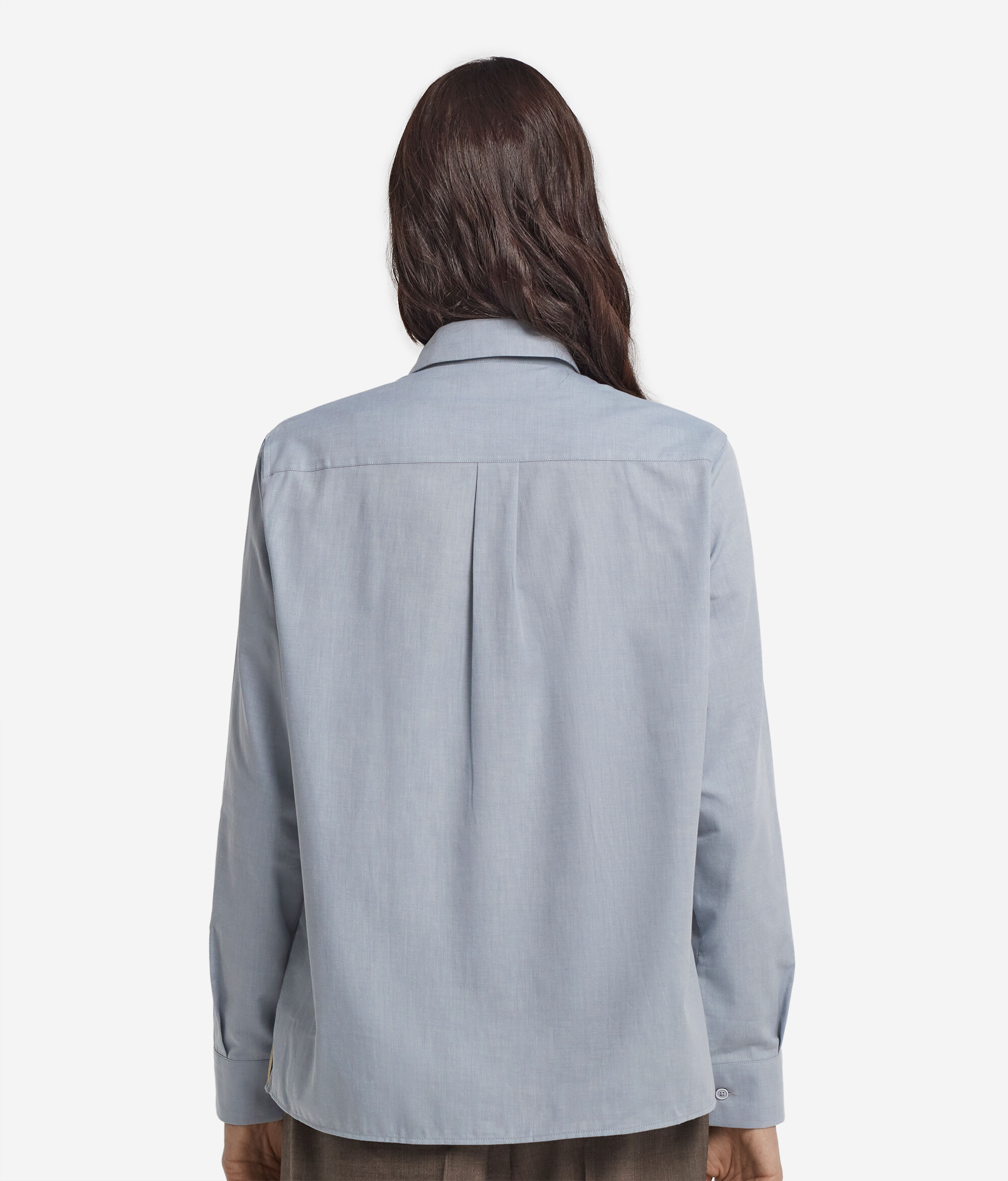 Essential and refined, this shirt is made of a soft cashmere cotton fabric that combines elegance and softness to the touch. The classic collar and hidden front placket give the piece a clean, contemporary aesthetic, while buttoned cuffs add a tailored touch. The rounded hem and Regular Fit. We recommend sizing up one to two sizes for the best fit create a fluid and versatile silhouette, perfect for refined casual looks that can be worn effortlessly in both informal and more sophisticated settings.