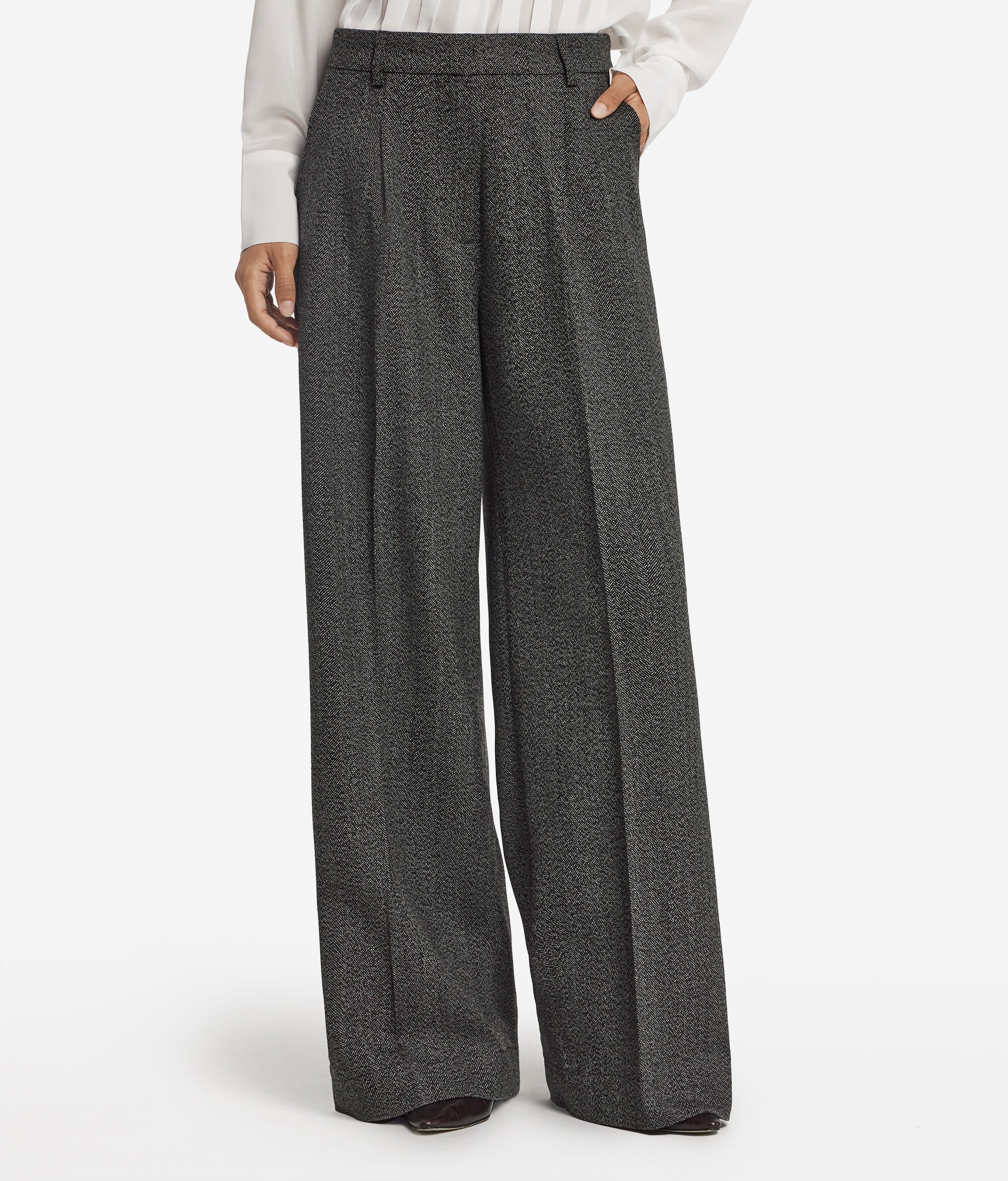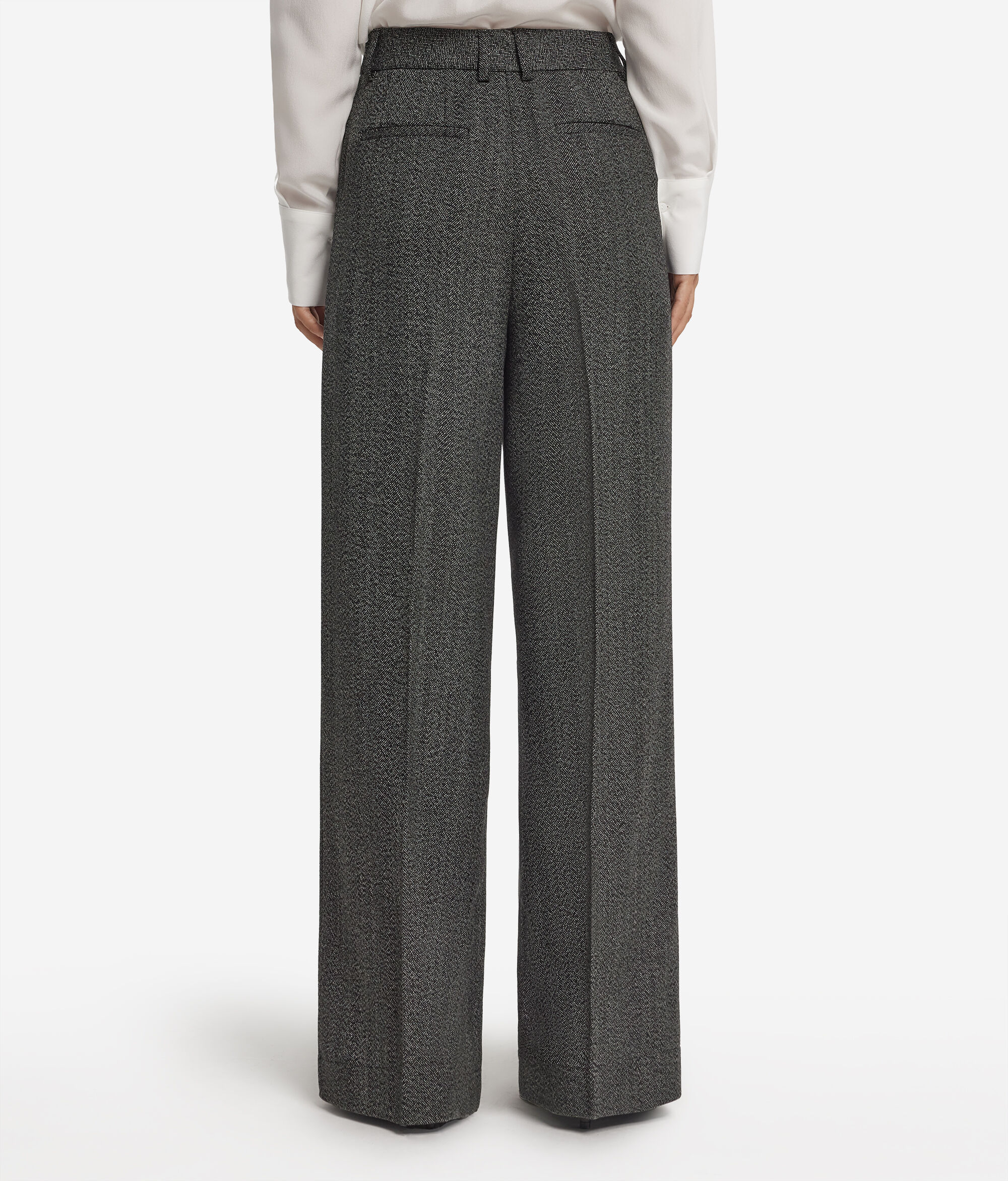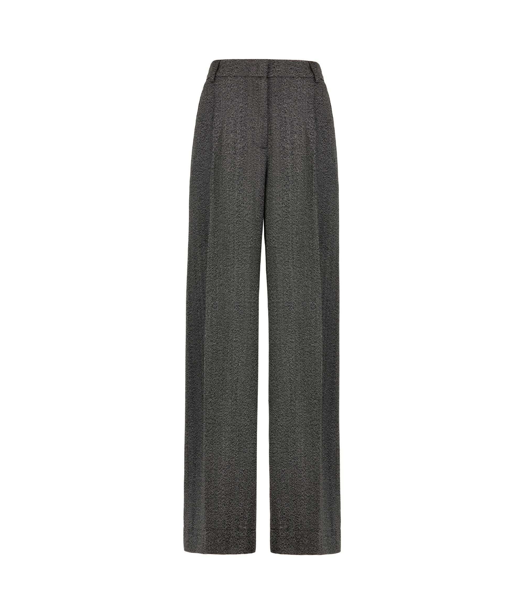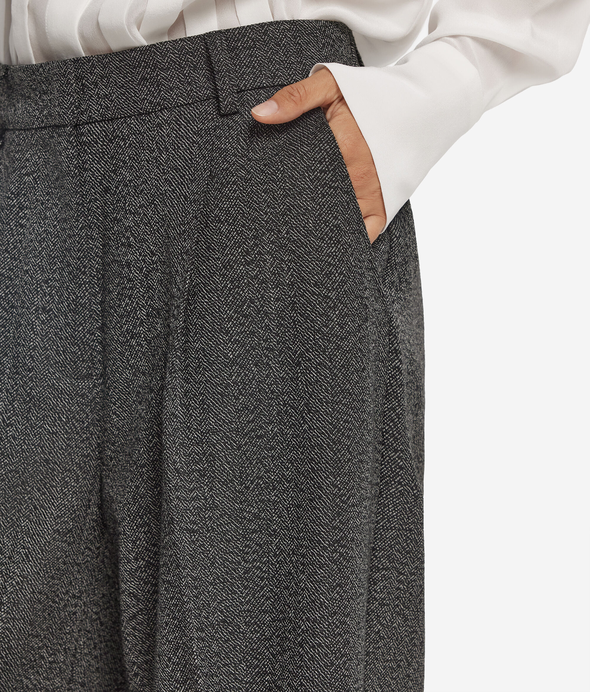 Crafted from premium herringbone wool, these trousers combine elegance and practicality in a bold design. The wide cut, enhanced by pleats on the front, enhances the structure and gives movement, while the zip, metal hook and counter button fastening maintain a clean line. The waistband with loops completes the design, adding a classic and versatile touch. With a floor-length silhouette and a relaxed fit, they are ideal for effortless, contemporary elegance.