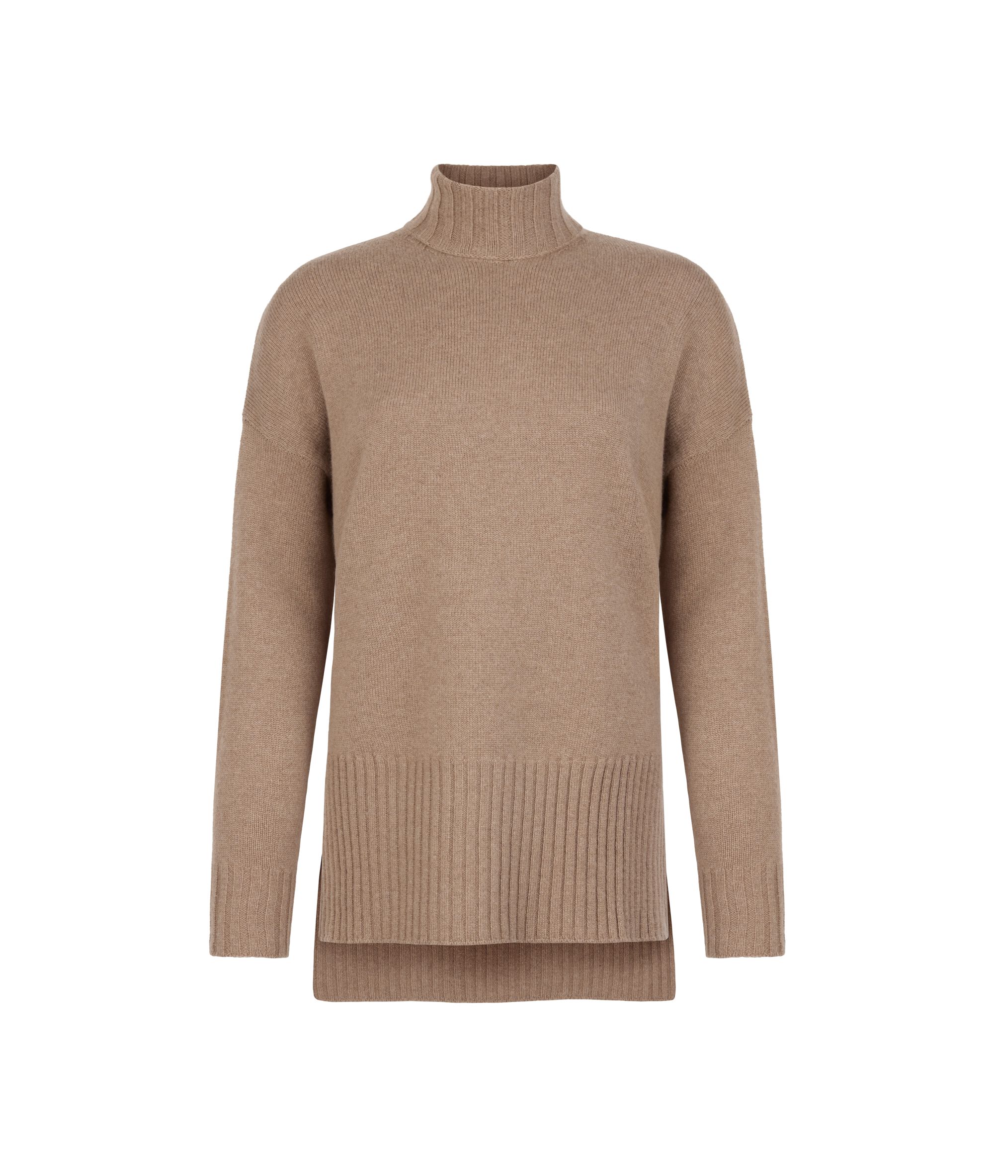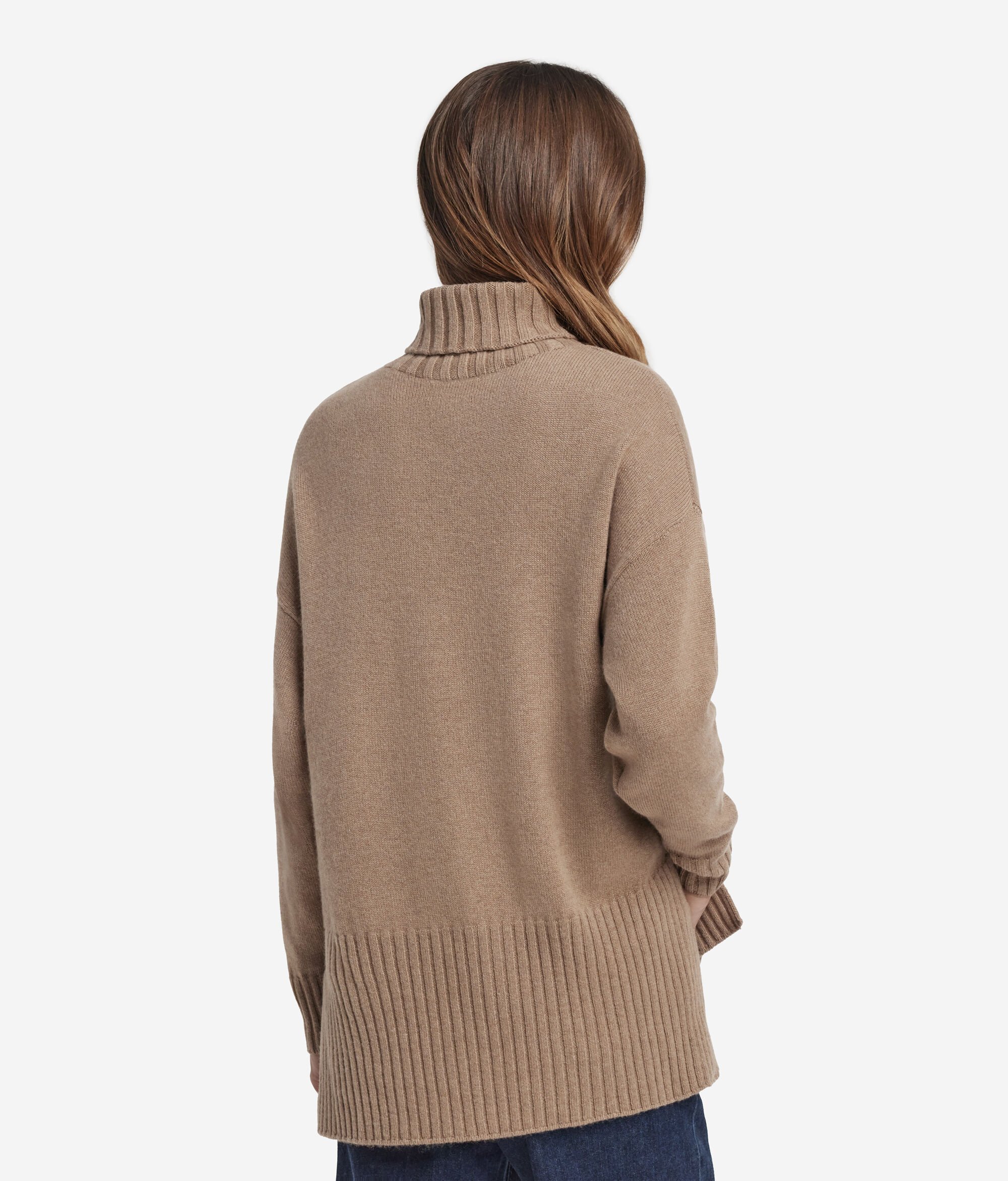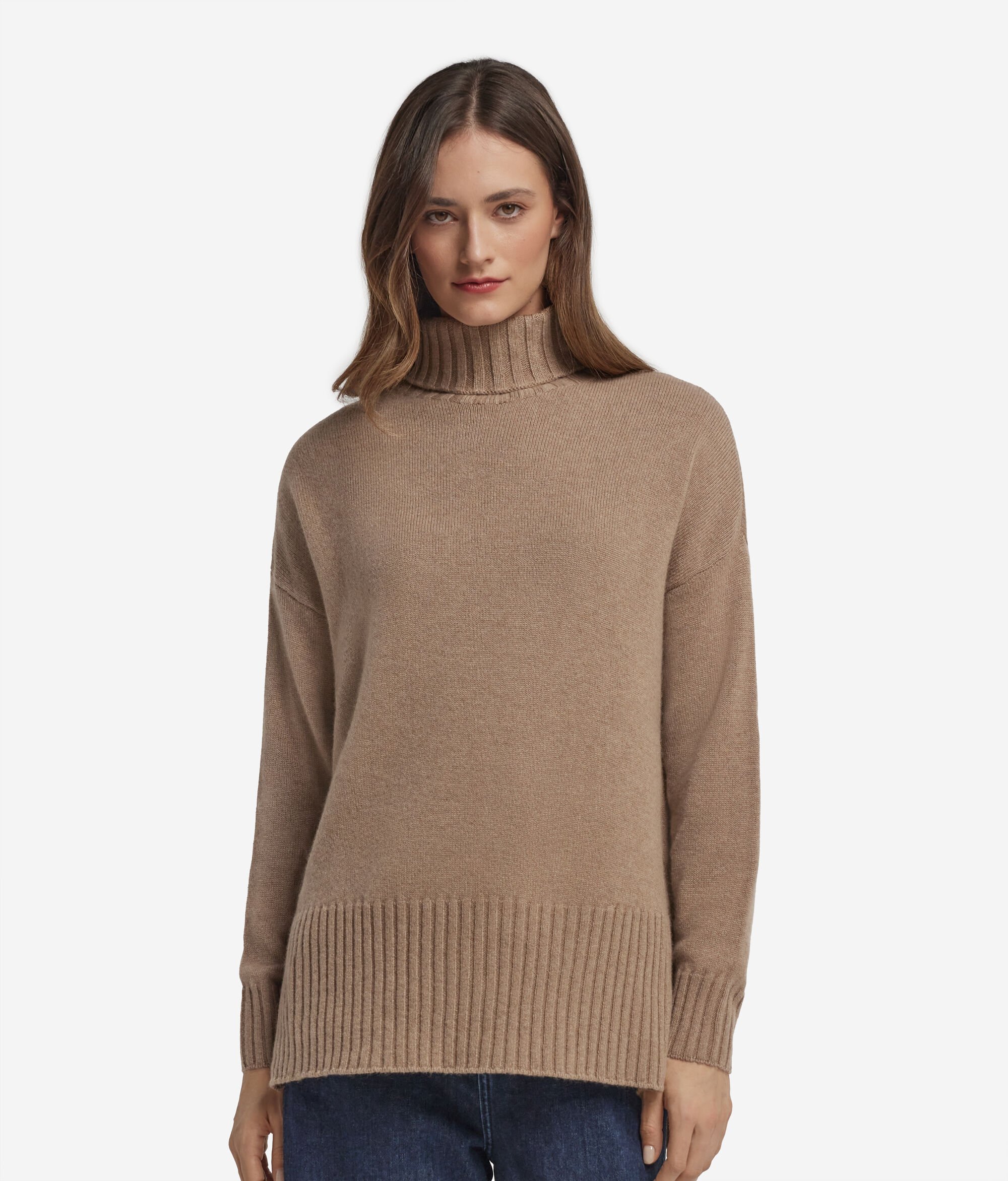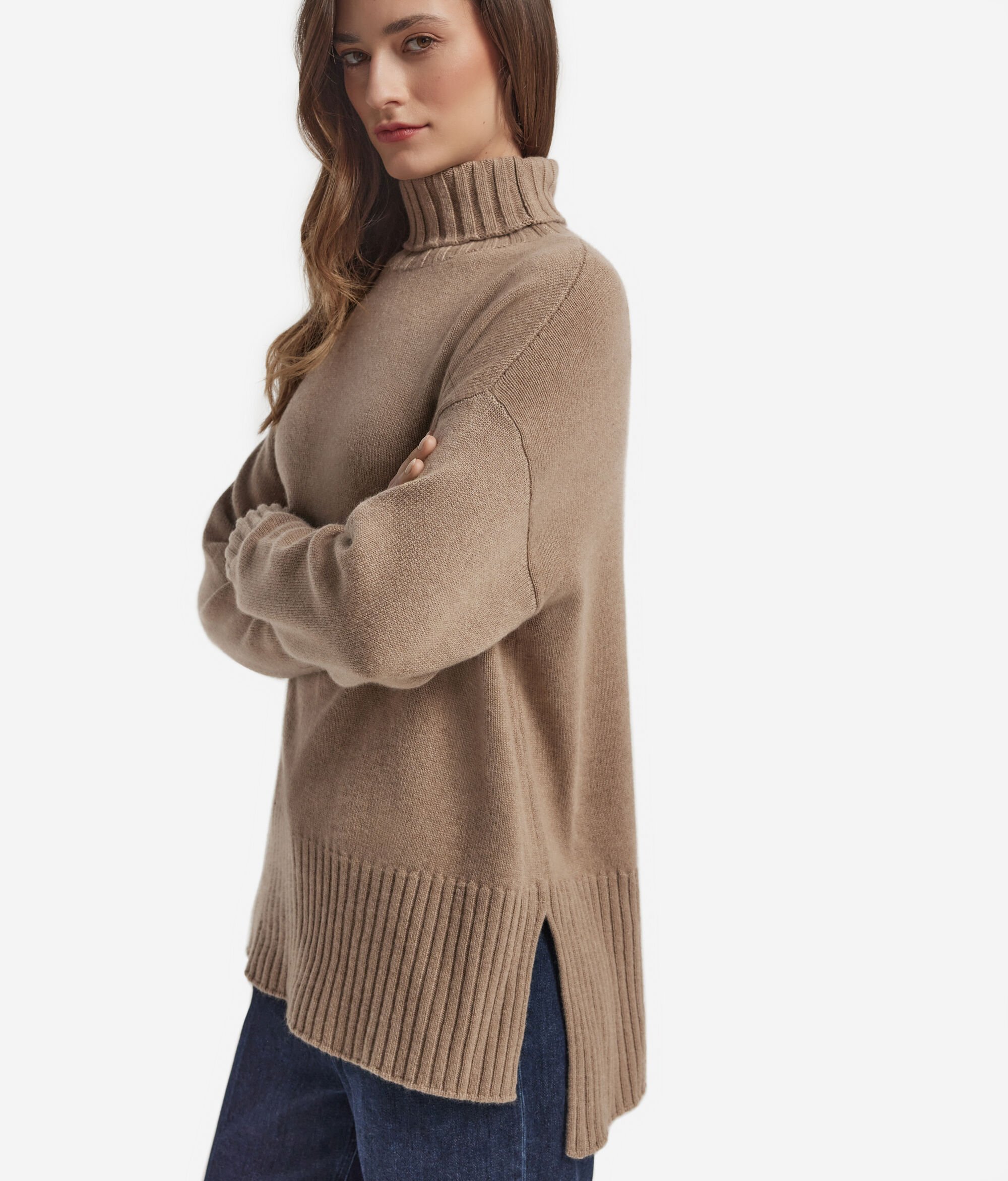 Wrap yourself in unparalleled luxury with Falconeri’s cashmere oversized turtleneck sweater. Made from ultrasoft cashmere, it offers an incredibly smooth and luxurious feel against the skin. The high turtleneck adds a bold, cozy statement, while its loose fit drapes perfectly for an effortlessly relaxed look. The turtleneck sweater’s slightly dropped shoulders enhance its laid-back yet refined silhouette, making it a versatile piece for layering or wearing solo. Ribbed details at the collar, cuffs, and hem provide subtle texture and structure, ensuring the cashmere sweater holds its shape while remaining soft and comfortable. The asymmetrical, oversized length offers a modern, flowing fit, creating an elevated silhouette that works beautifully tucked into trousers or left loose over leggings. Finished with side slits for added movement, this cashmere oversized turtleneck exudes both ease and sophistication. The artisanal garment-dyed colorways give each piece a unique depth, with slight variations in color that make your oversized high-neck sweater one of a kind.