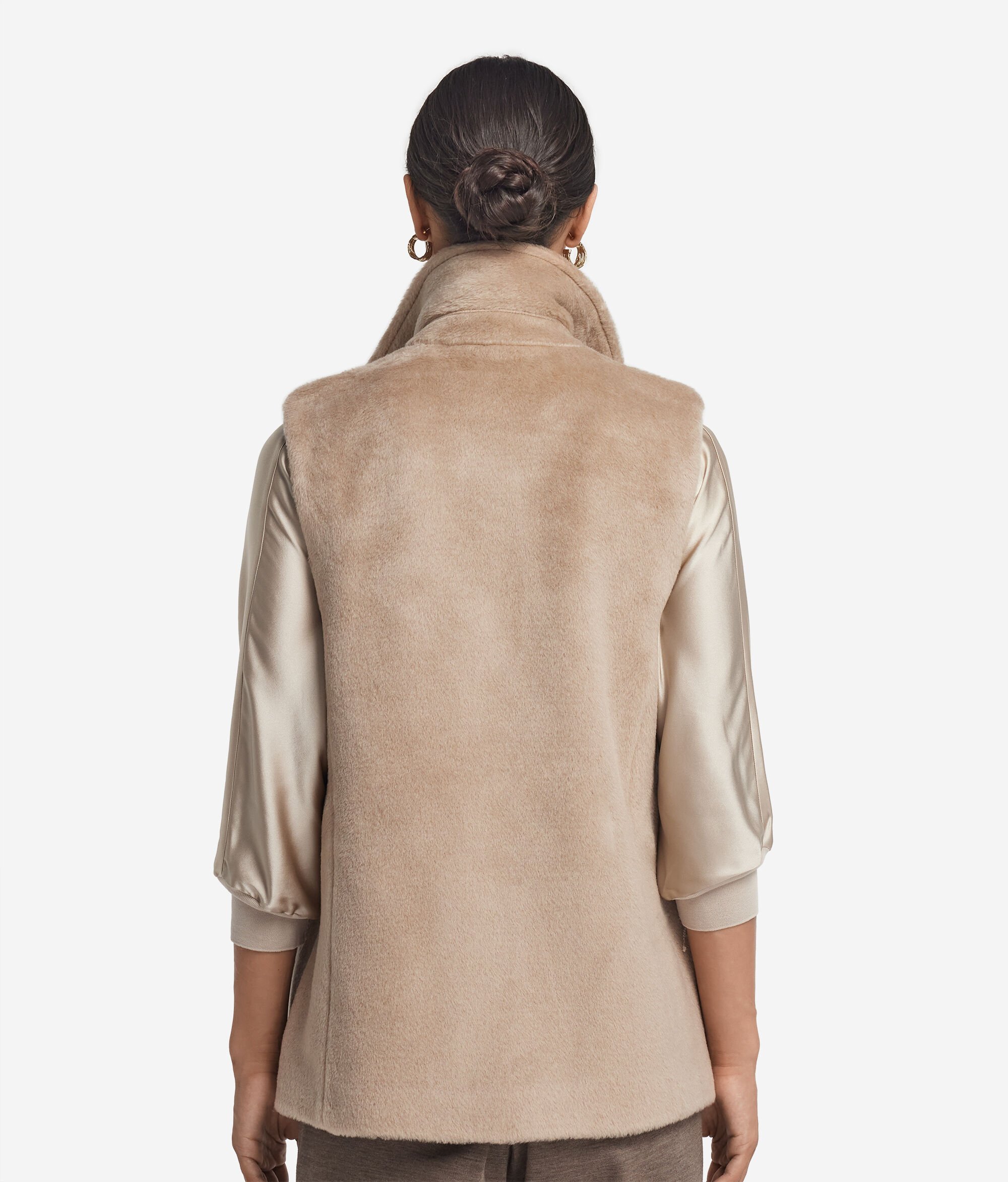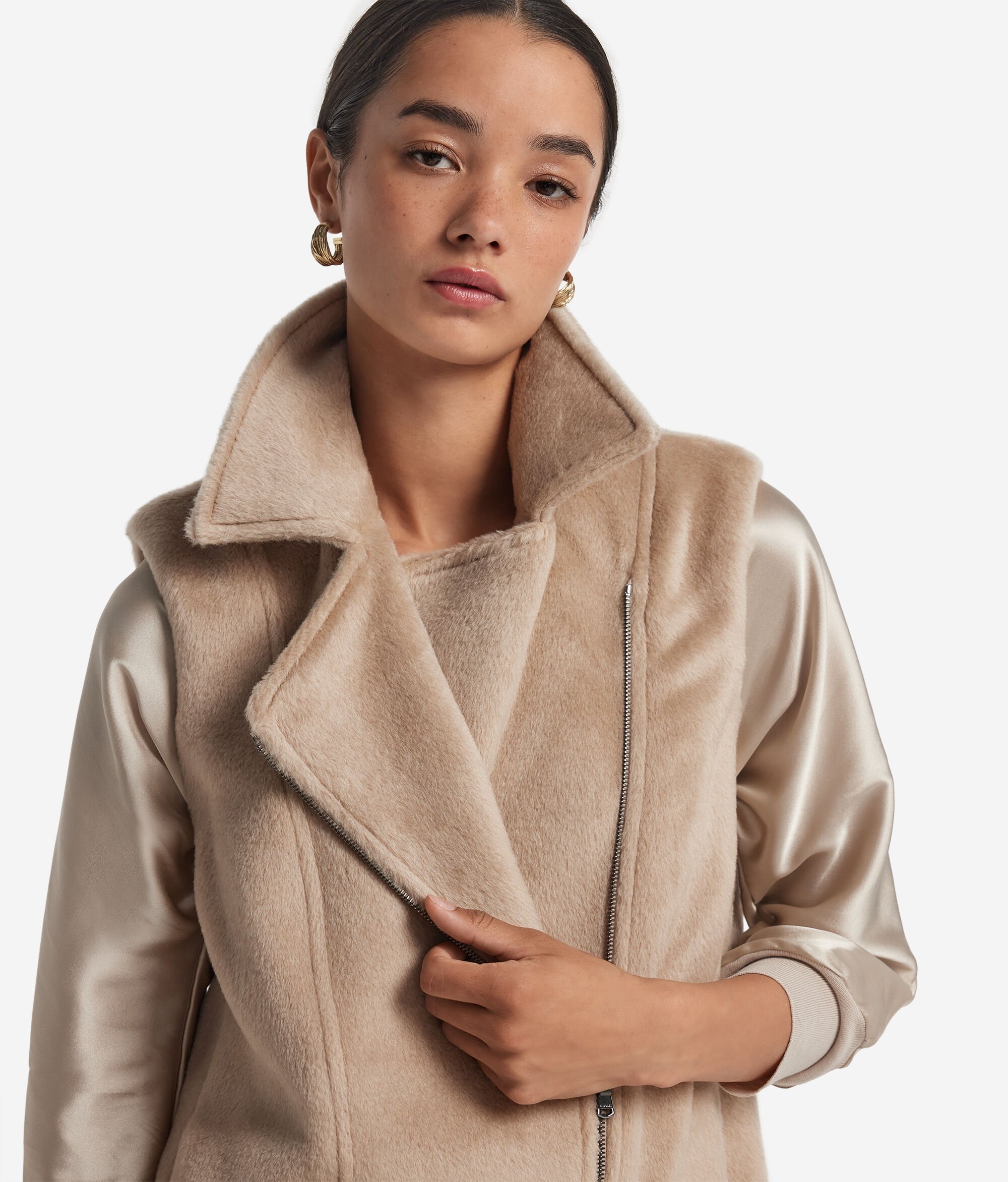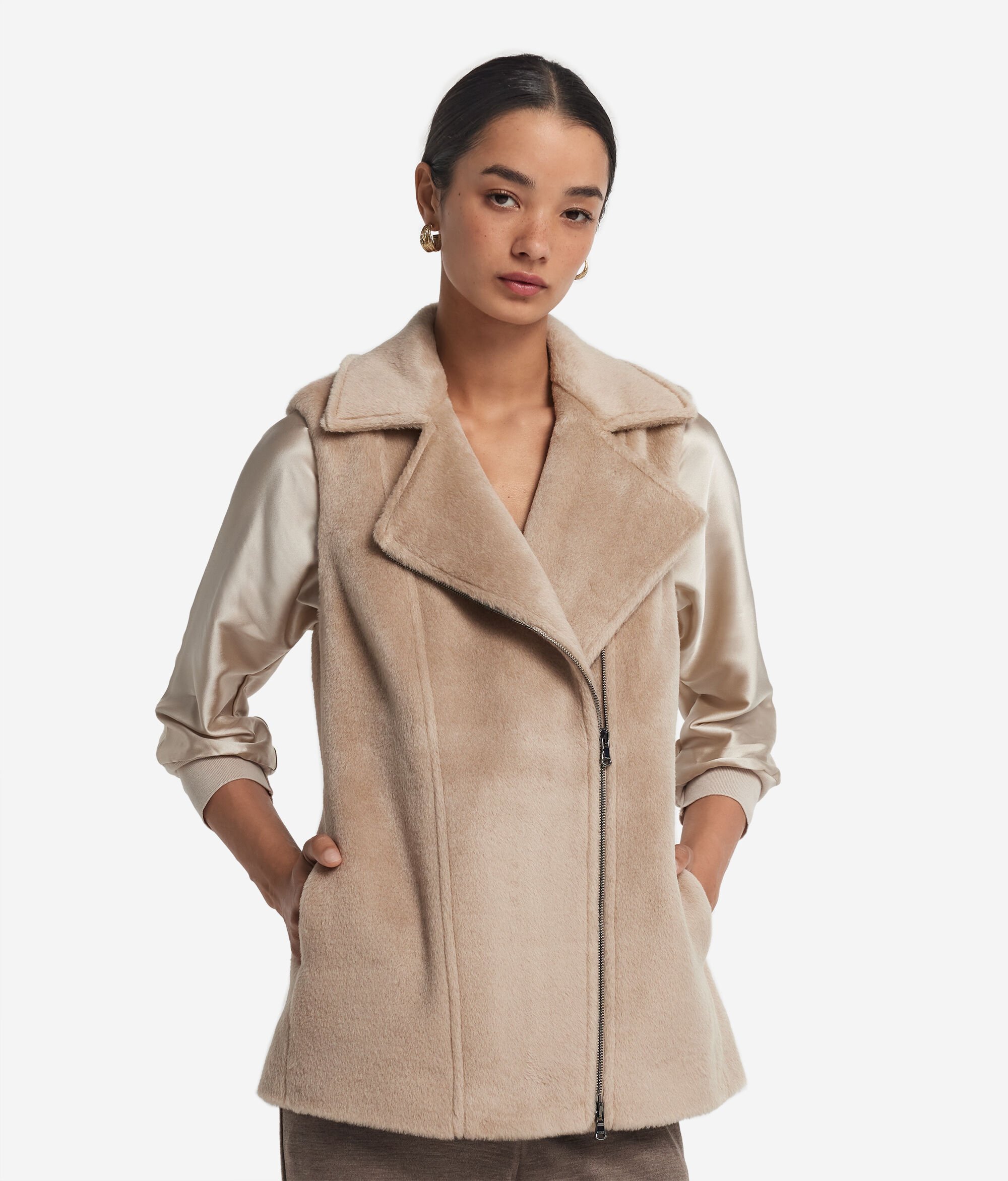 With a bold and refined style, this sleeveless biker jacket combines character and softness thanks to the fur-effect fabric in fine alpaca wool. The design is enhanced by a wide lapel collar and a diagonal metal zip, for a bold touch full of character. The side welt pockets keep the line clean and functional, perfectly in harmony with the classic silhouette that with a balanced and understated fit.