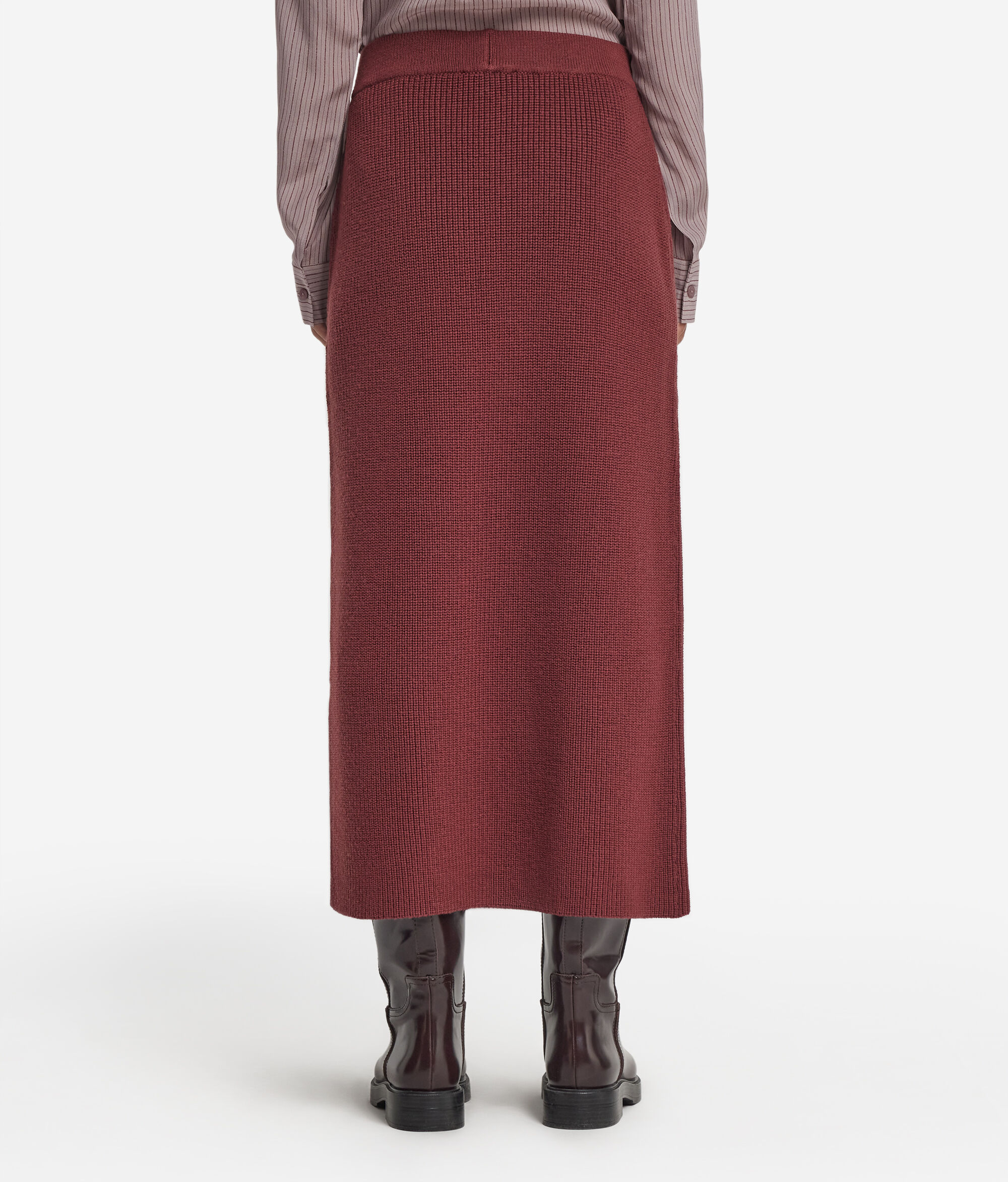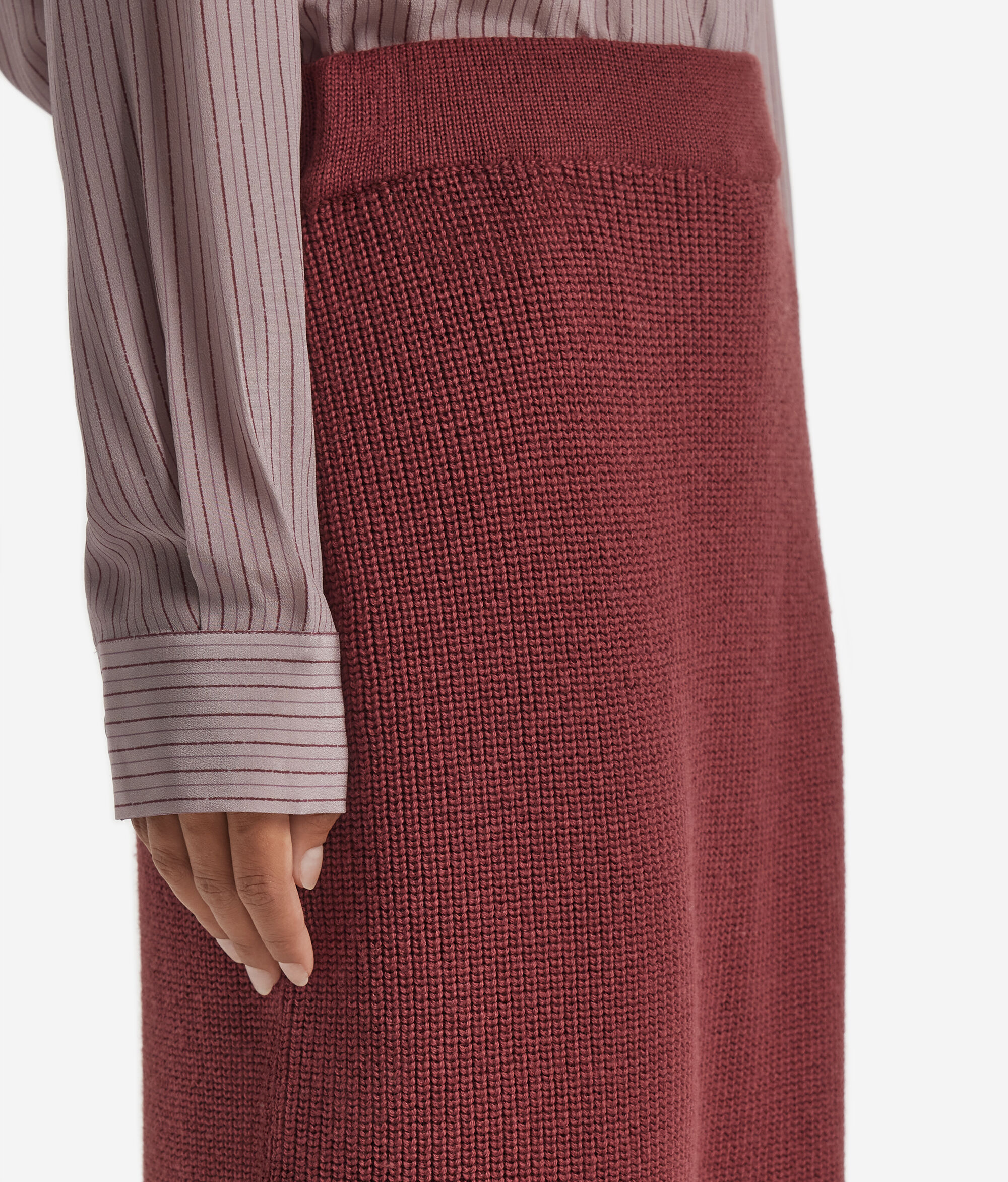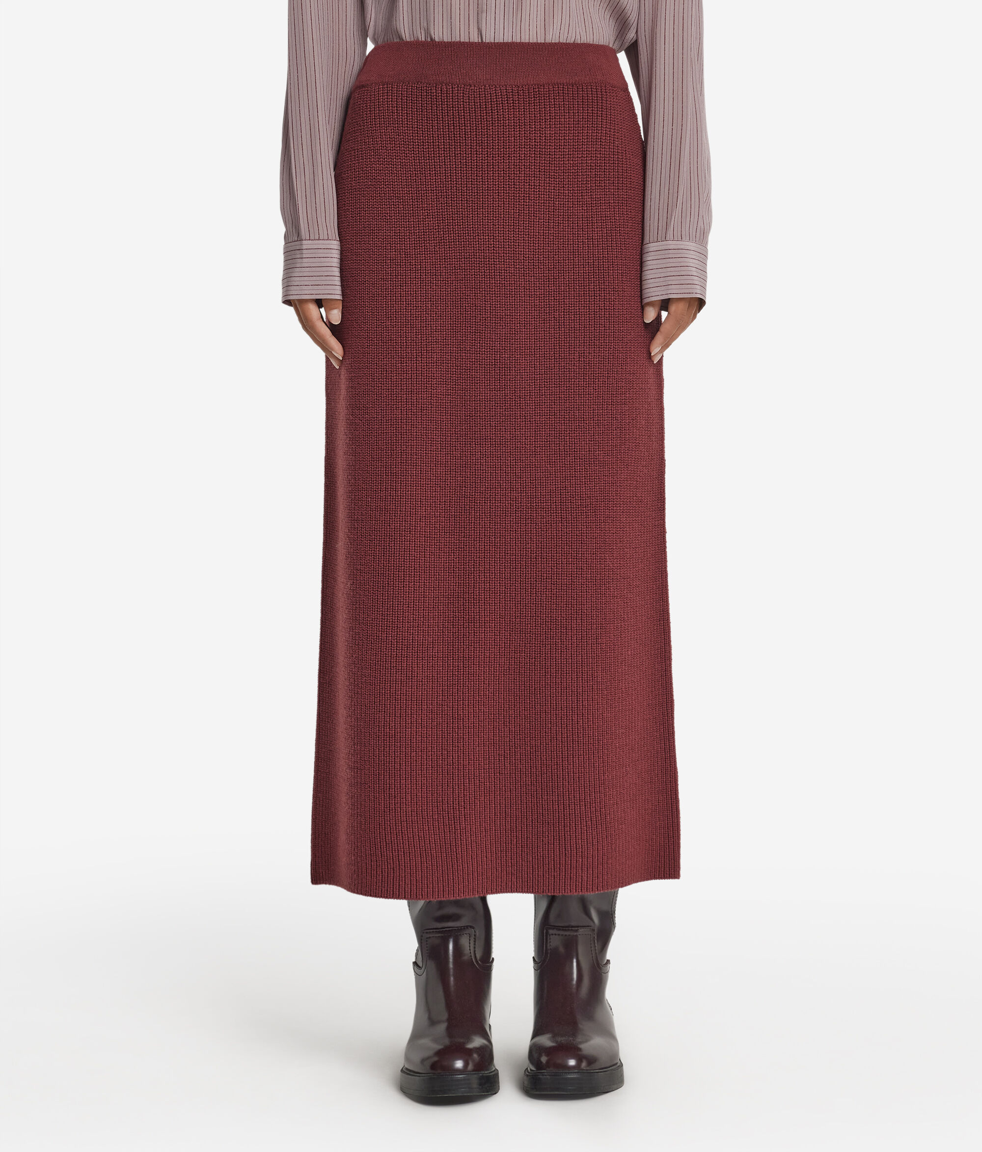 Essential lines and refined texture: the ribbed wool enhances the timeless design of this skirt. The elastic waistband and the straight, slightly shaped cut delicately follow the silhouette, accompanying every movement with elegance. The midi length creates a perfect balance, providing the piece with a versatility that adapts to sophisticated yet spontaneous looks, ideal for any everyday occasion.