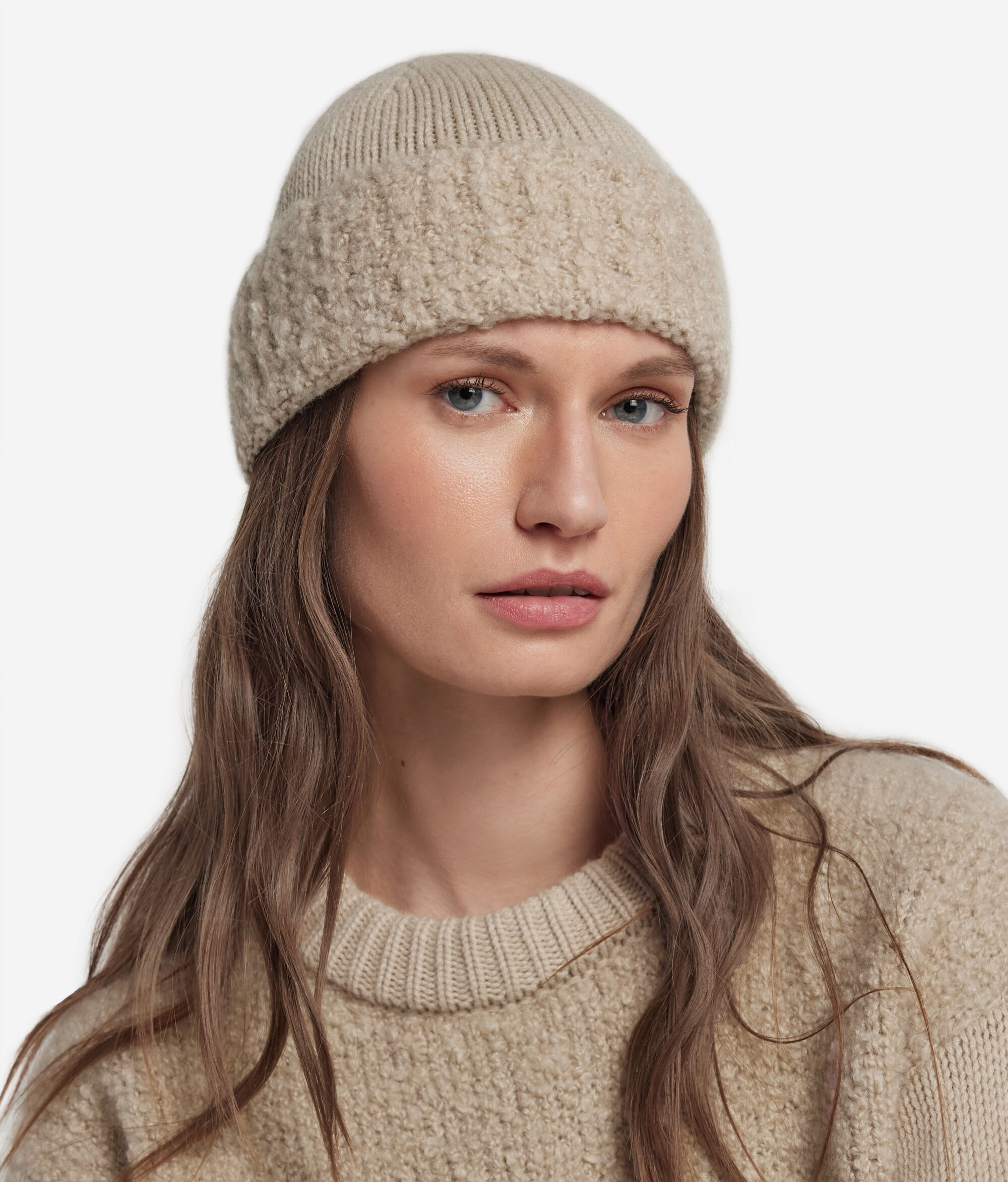 A play of textures enhances this Ultrasoft Cashmere cap. The yarn wraps the piece in a lightweight embrace, while the ribbed bouclé adds a textured and contemporary detail, capable of transforming an everyday accessory into a distinctive style element.