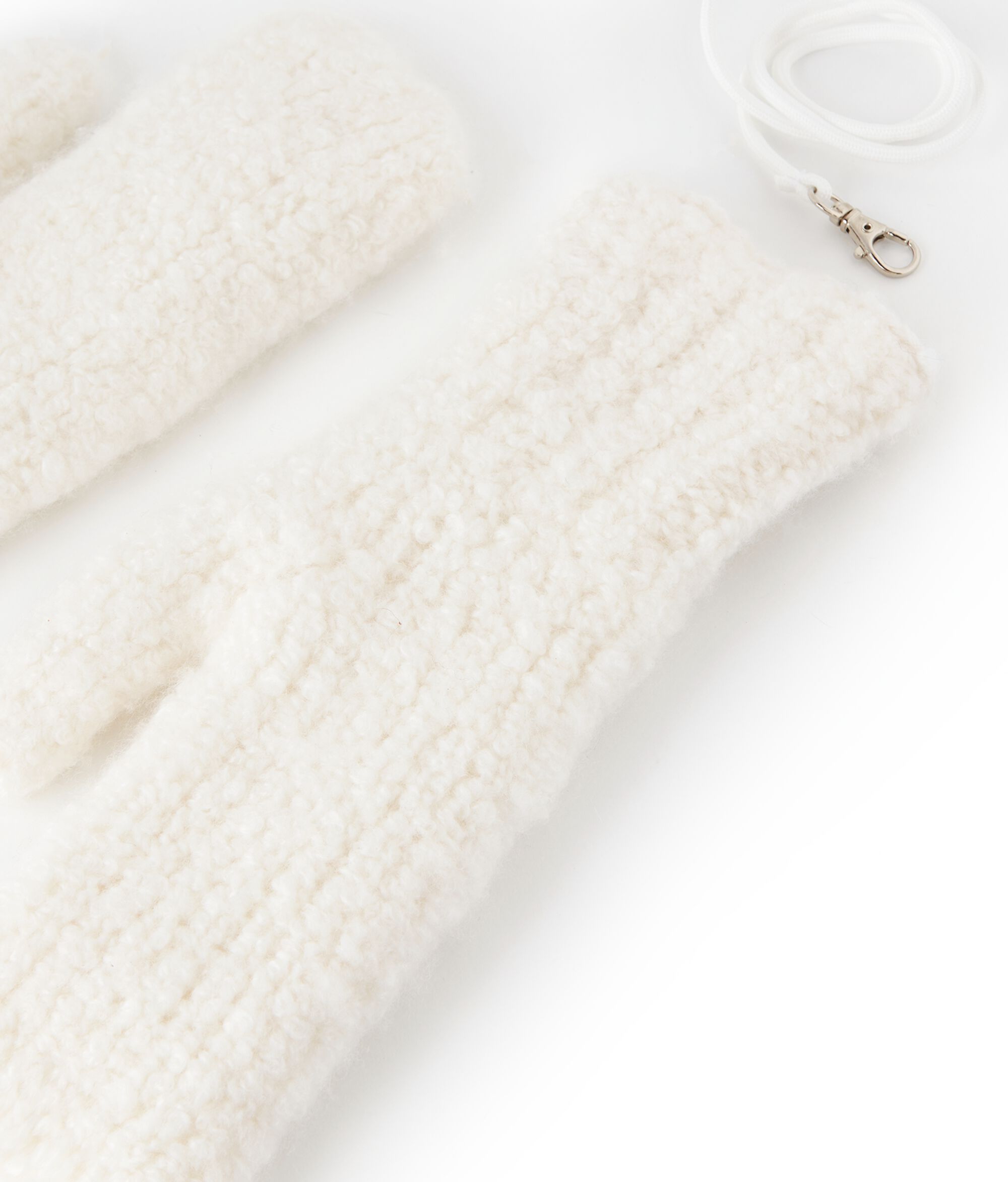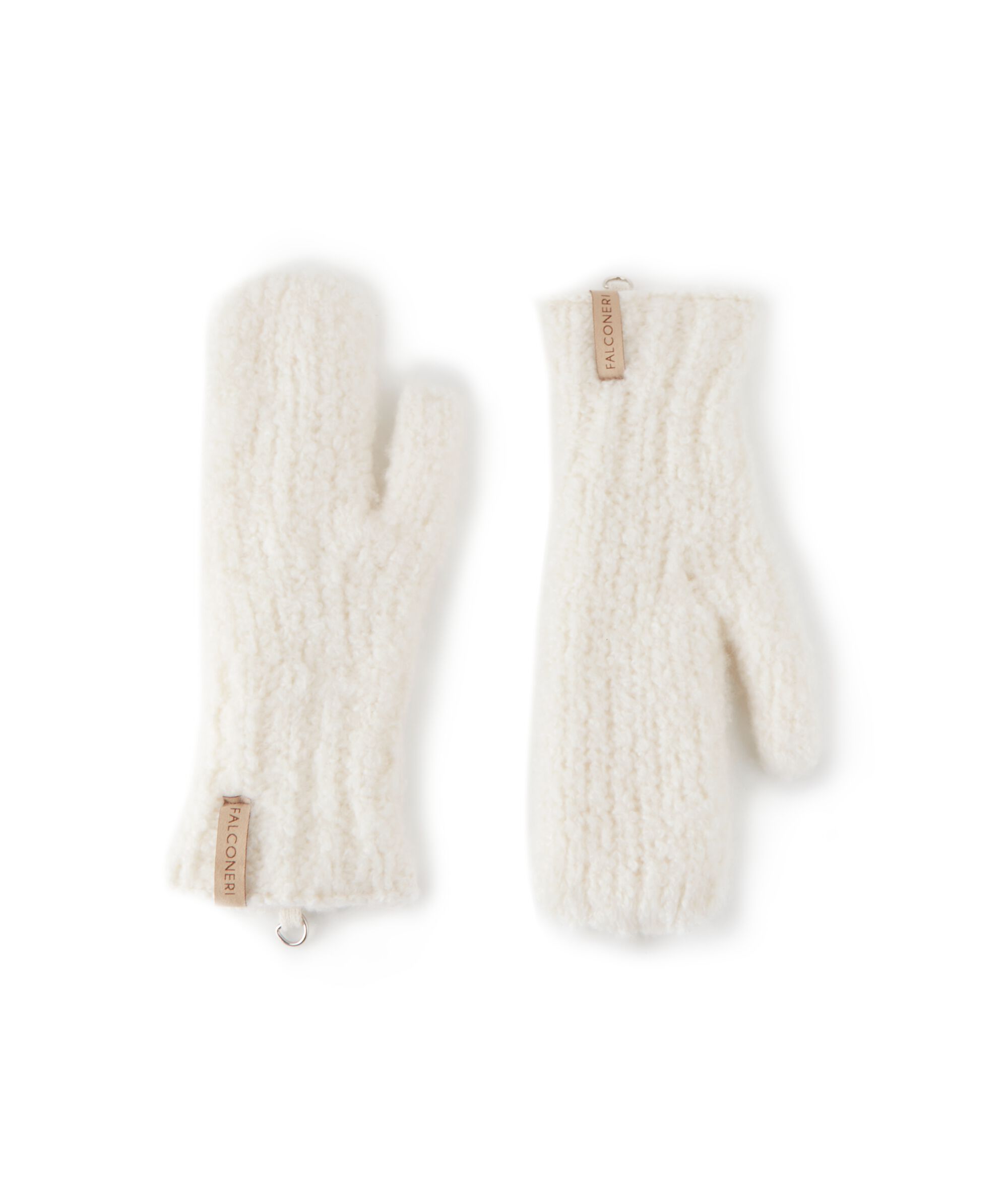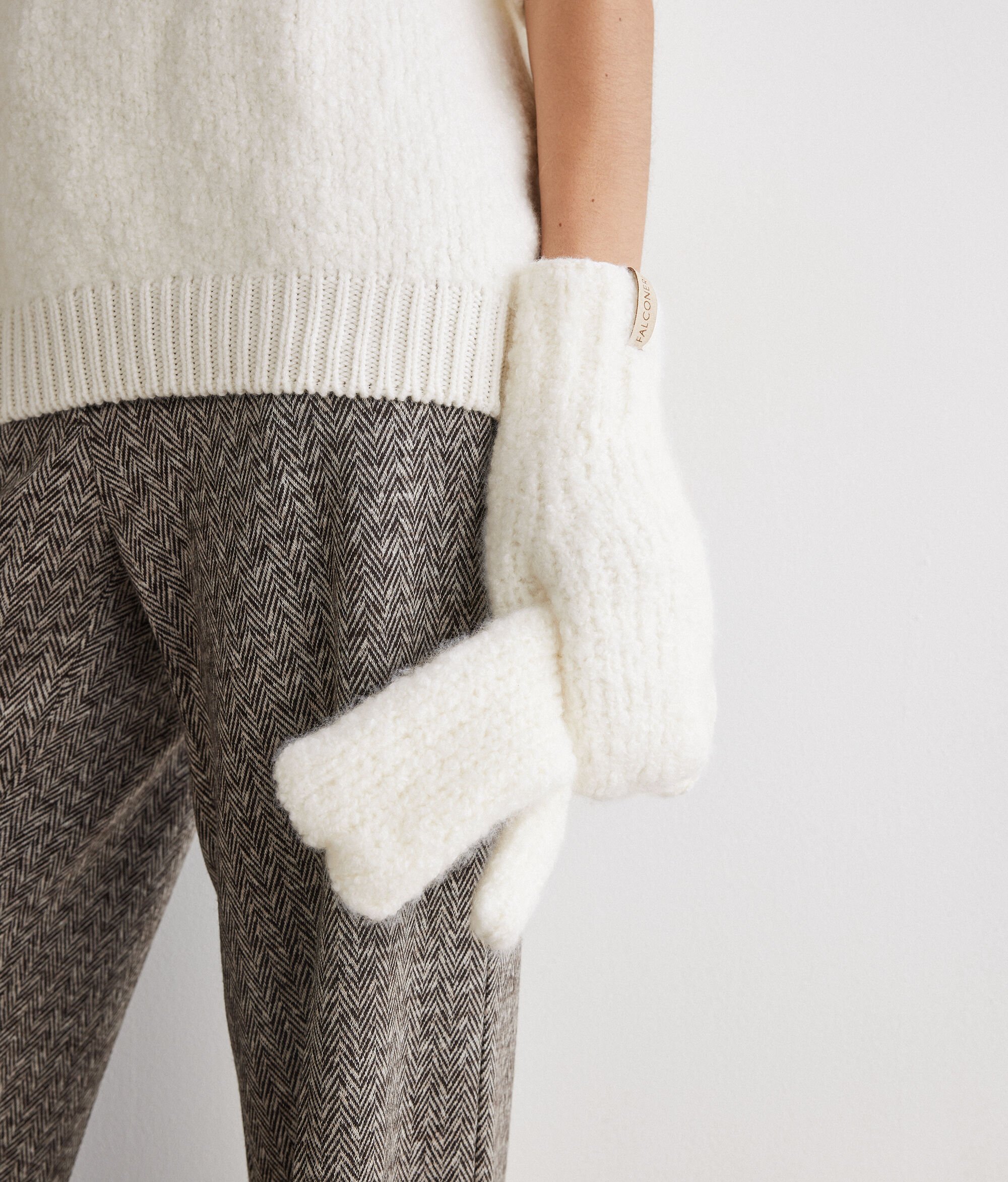 A symmetry of softness and texture characterizes these mittens: on the inside, the Ultrasoft Cashmere plain knit envelops the hands in a warm and light caress, while on the outside the bouclé knit adds character and refinement. Discreet details such as the metal rings and the cord with snap hooks combine practicality and style, transforming a winter accessory into a versatile and sophisticated companion.