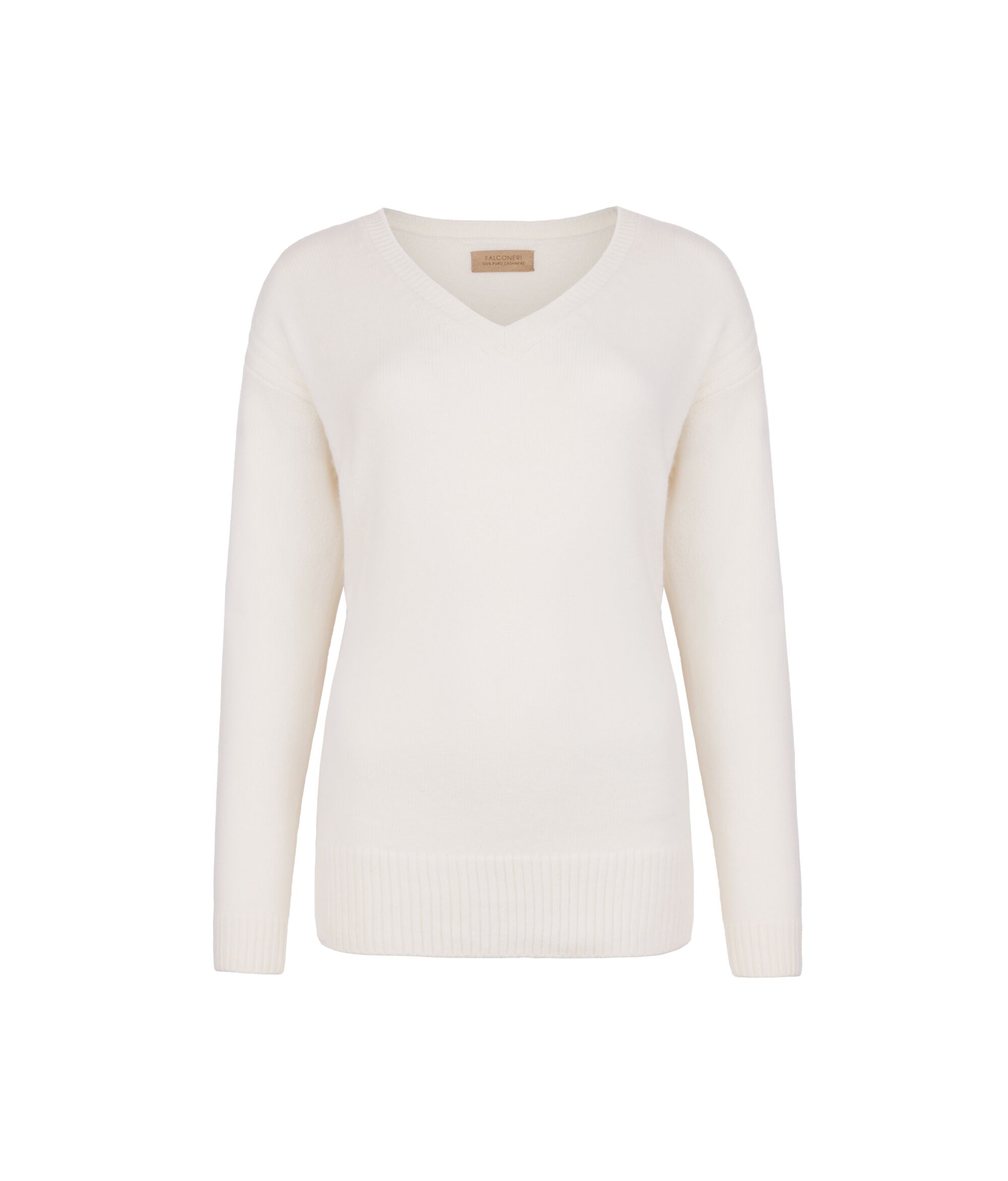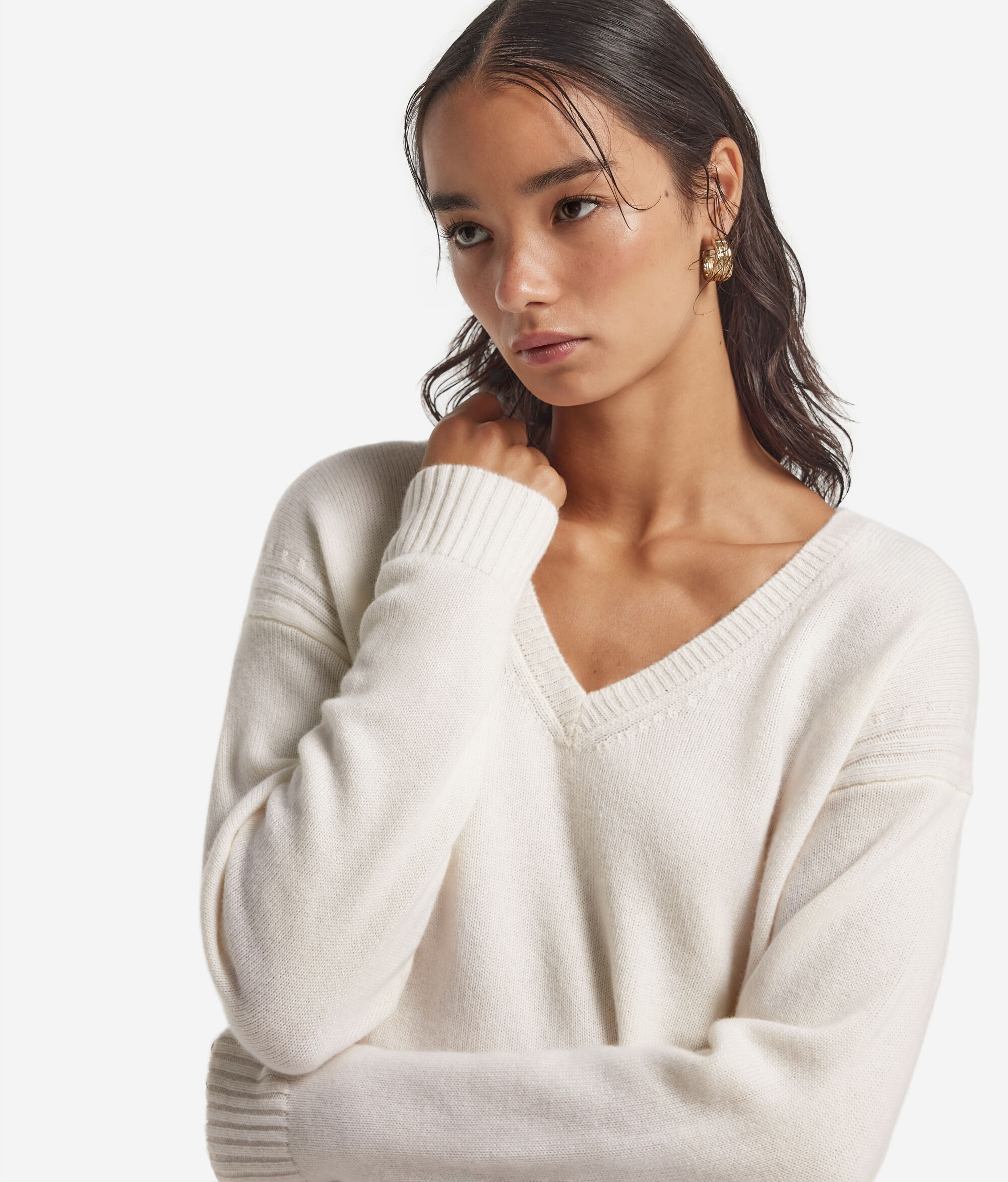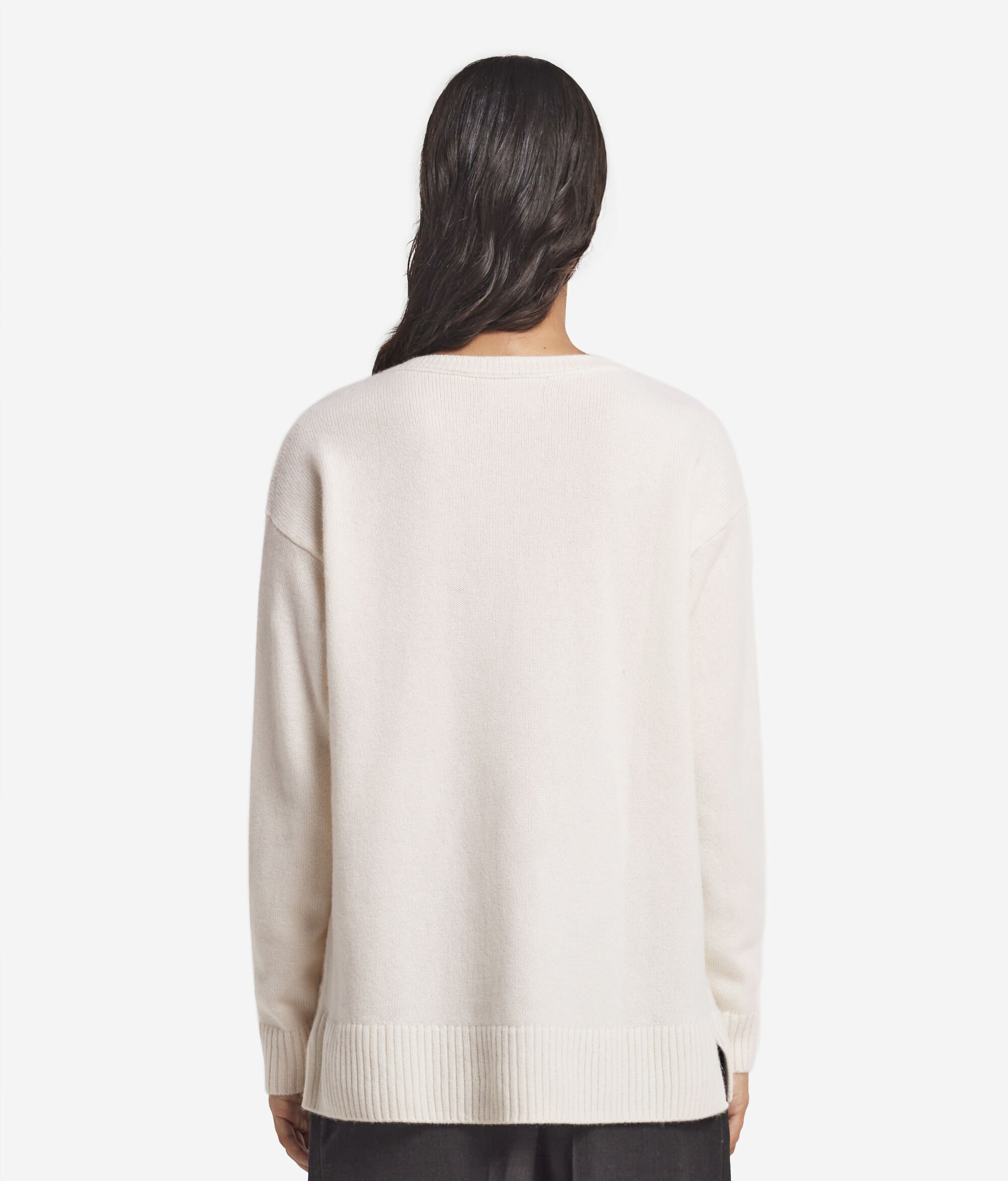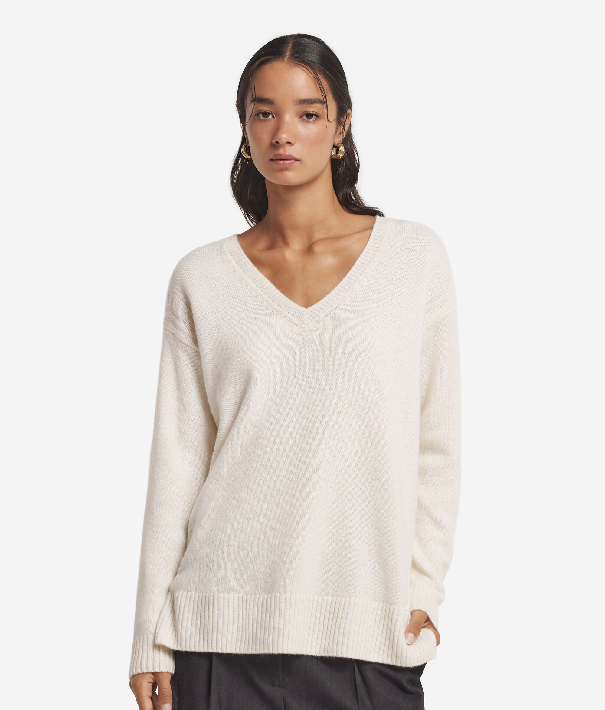 Made of Ultrasoft Cashmere, this sweater stands out for its immediate comfort and elegant line. The V-neckline frames the neckline naturally, while the cable-knit detail on the sides adds a touch of refined craftsmanship. The delicate side slits enhance the fluidity of the fit, soft and casual, perfect for an essential yet sophisticated style.