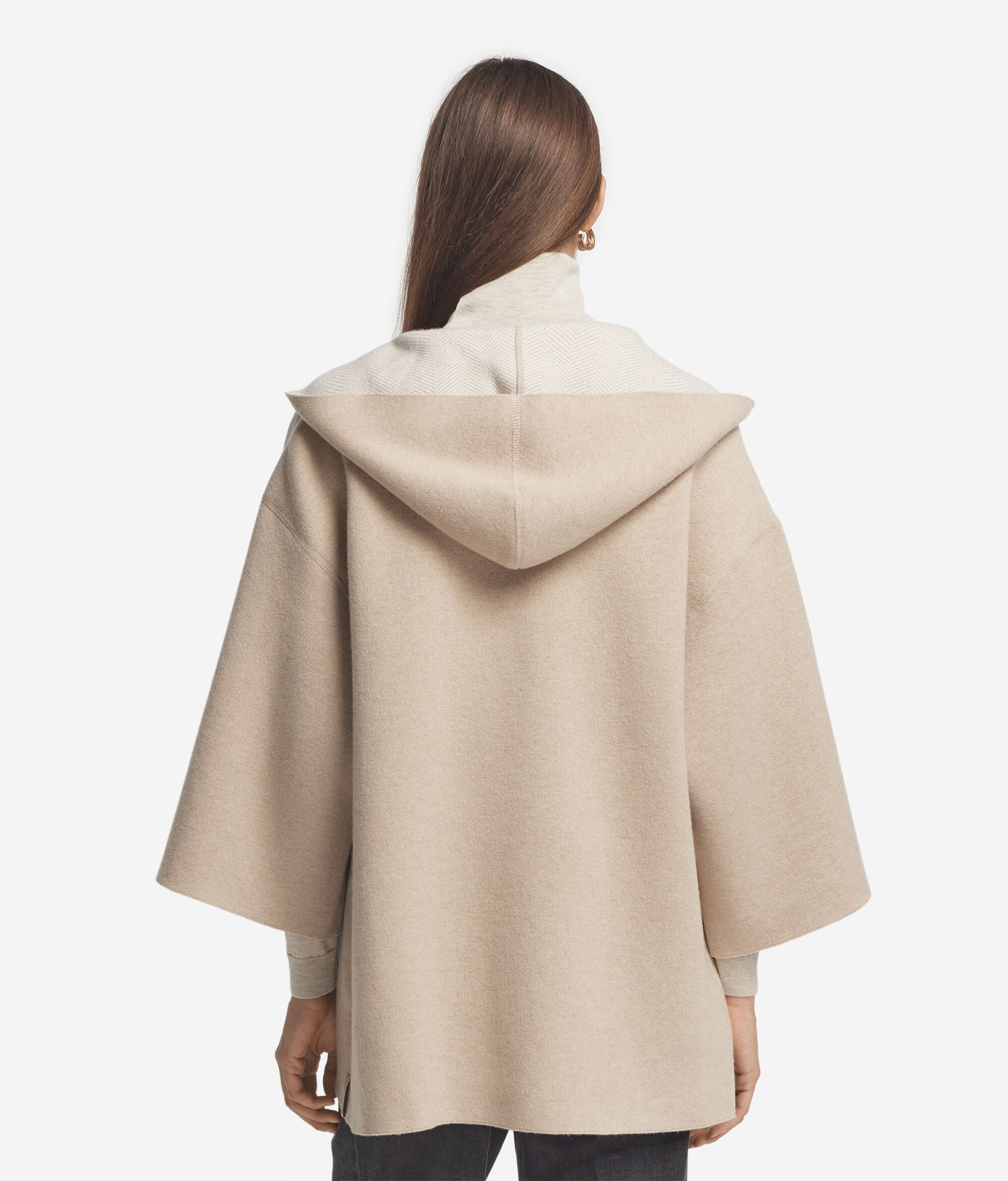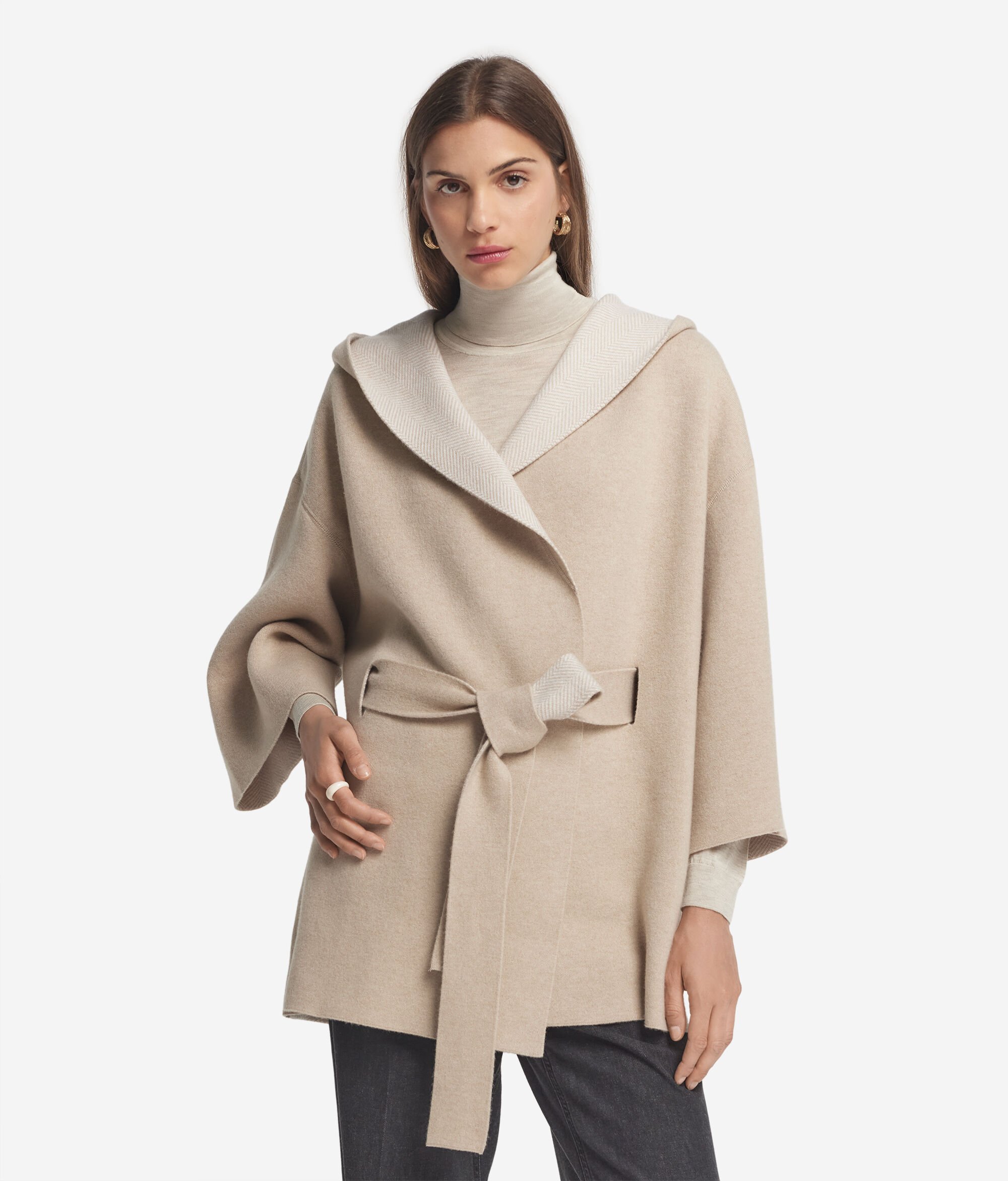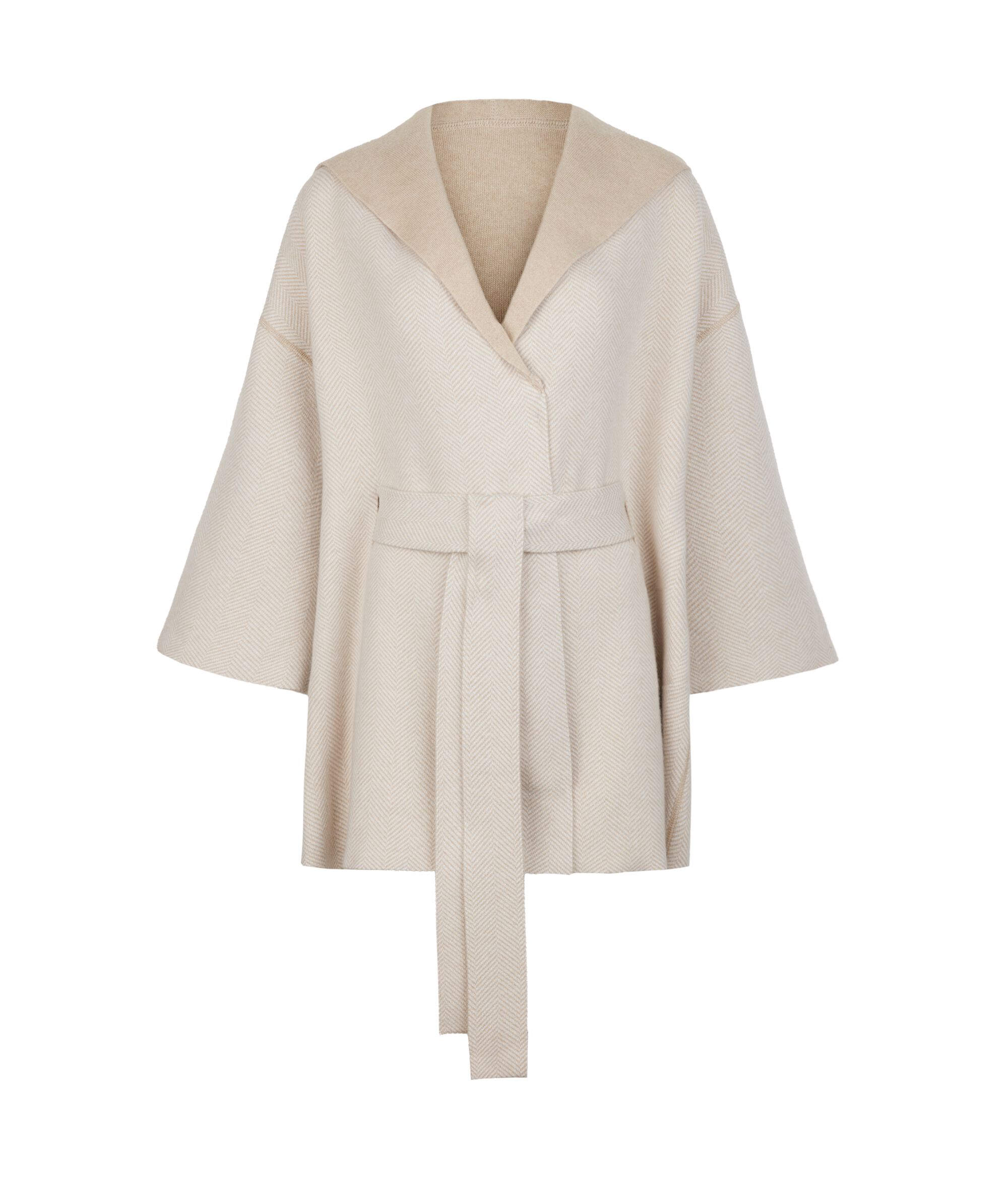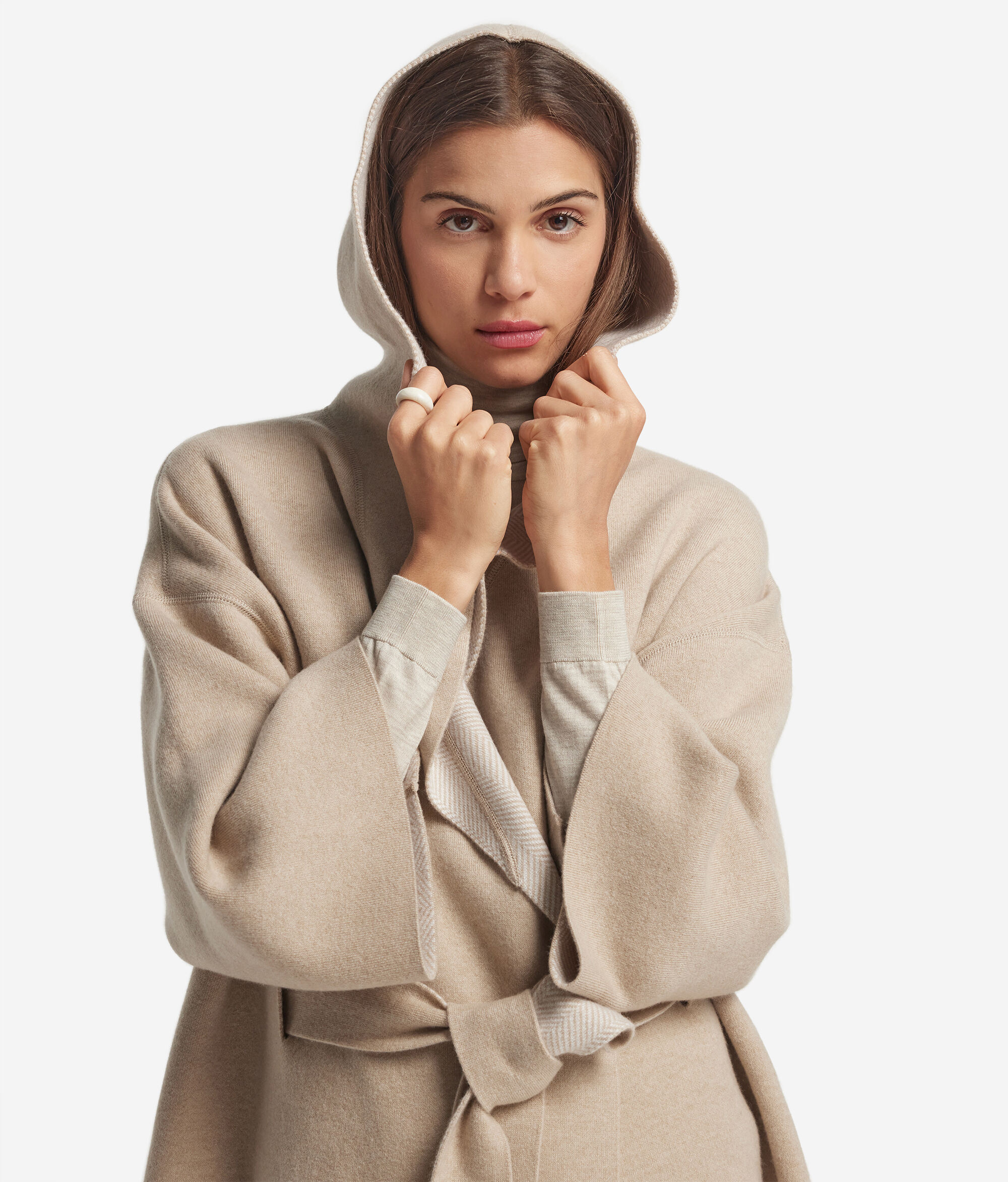 Made of Ultrasoft Cashmere, this reversible cape combines comfort and sophistication. The shawl-like collar with hood and dropped shoulder provides a relaxed and contemporary allure, while the front opening with belt holes allows for a customizable fit. With a hip length, it is ideal for layering naturally with any outfit.