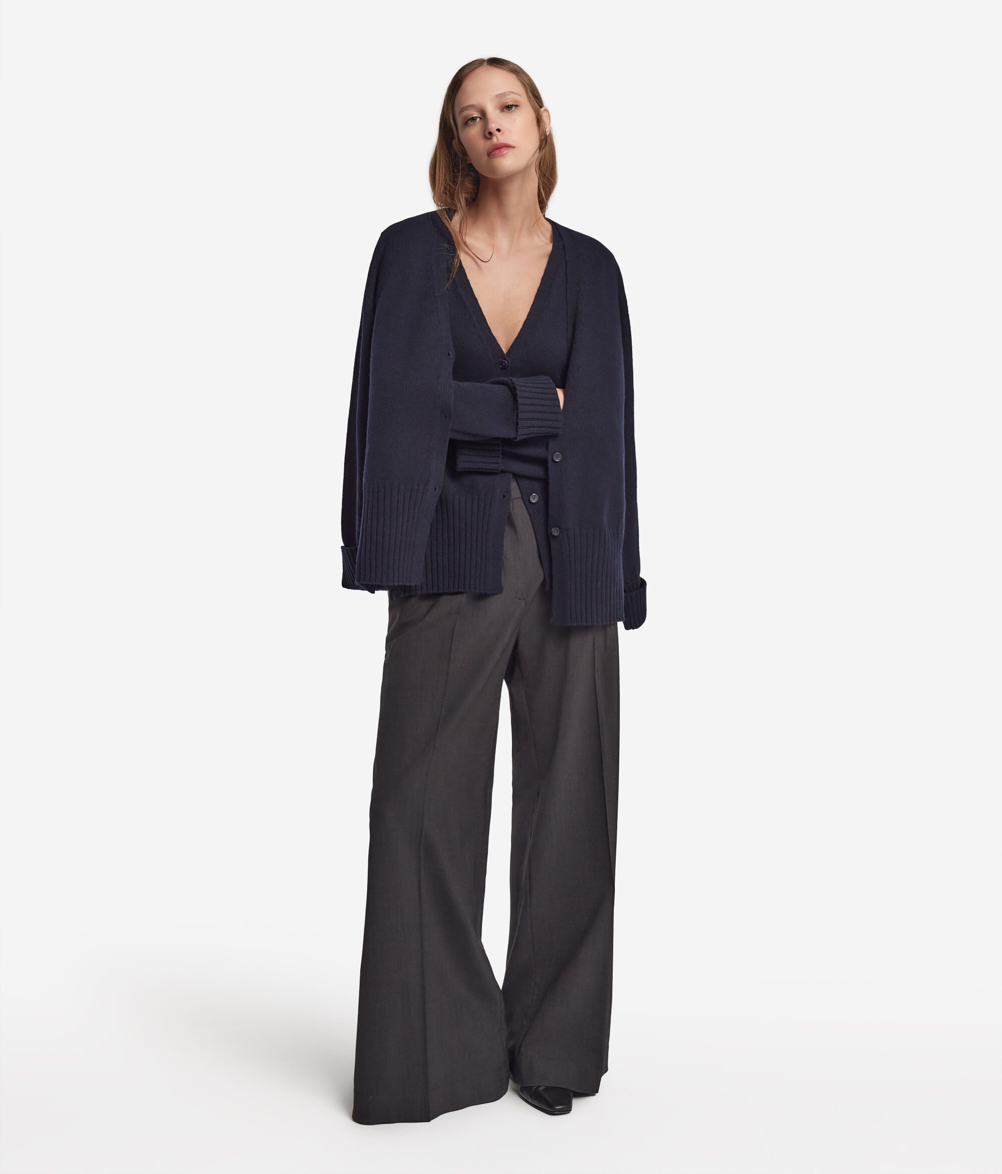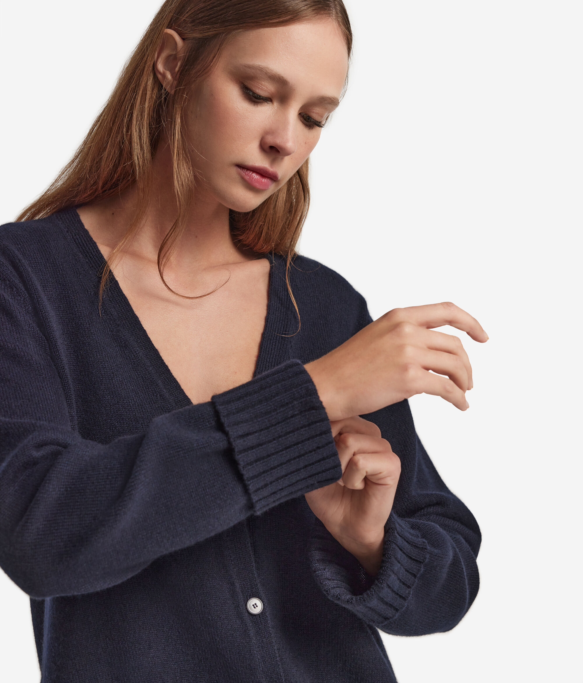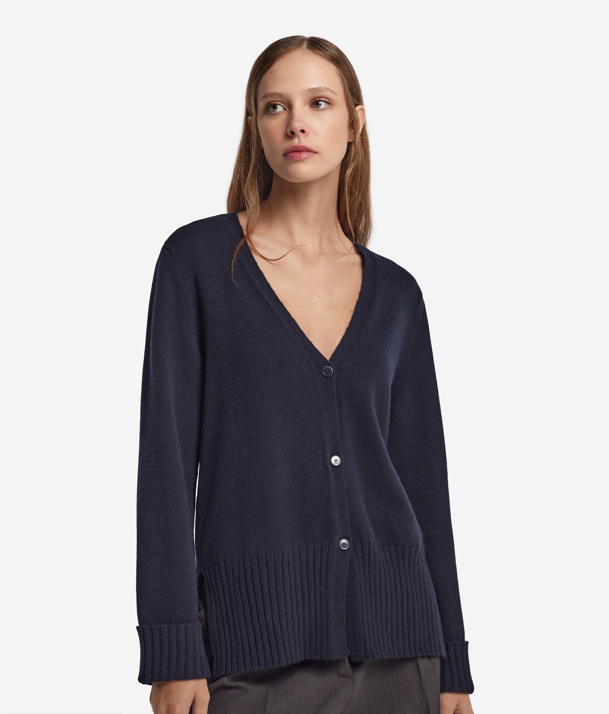 In a delicate blending of softness and character, this V-Neck cardigan combines the quality of Ultrasoft Cashmere with fine craftsmanship. A three-button tone-on-tone front closure adds a touch of understated elegance, while slits at the hem provide the design with fluidity and movement. A ribbed finish on the turned up hem and cuffs enriches the piece, providing it with a refined and polished look.