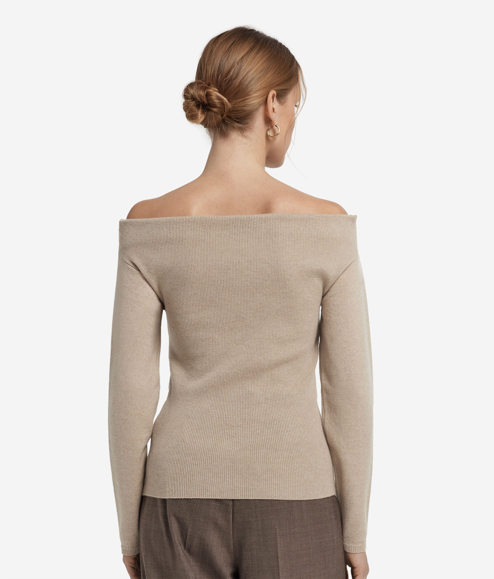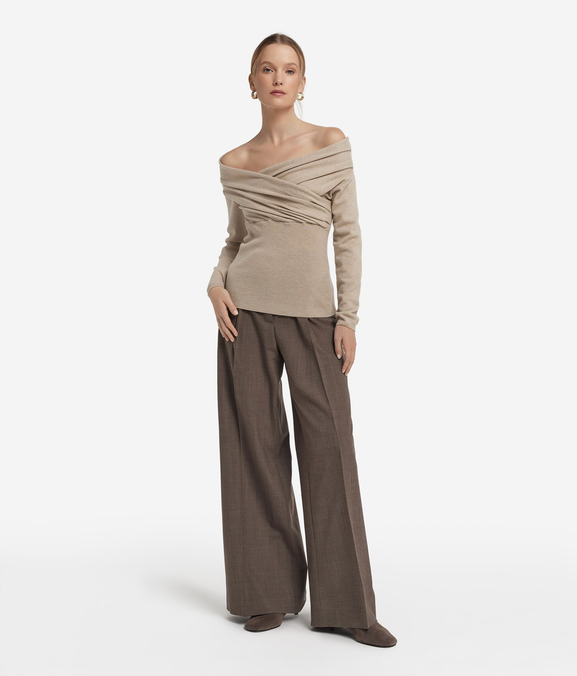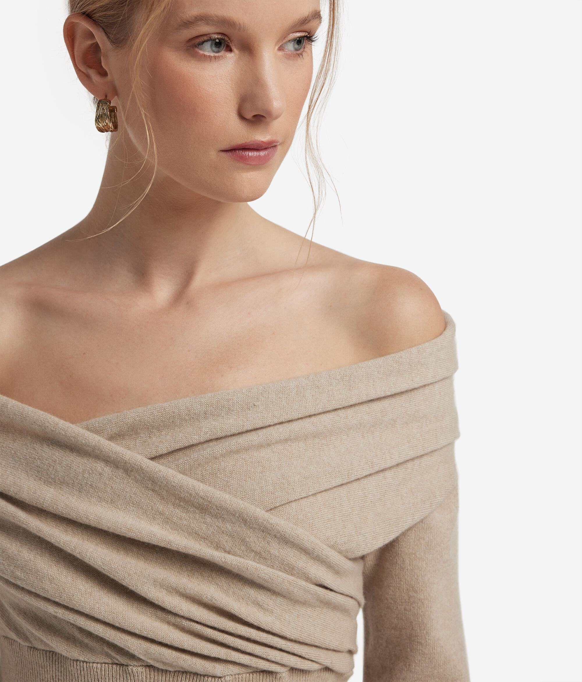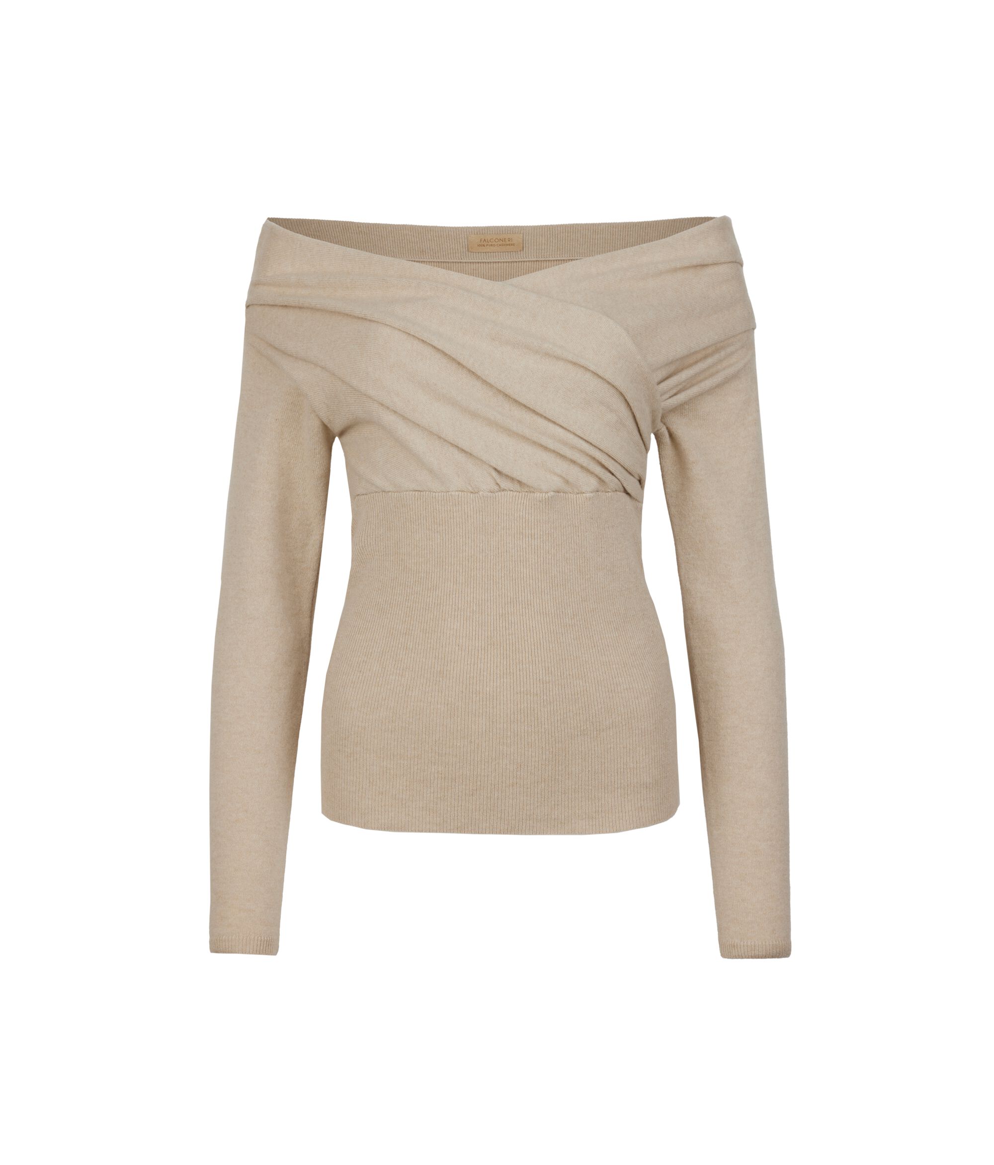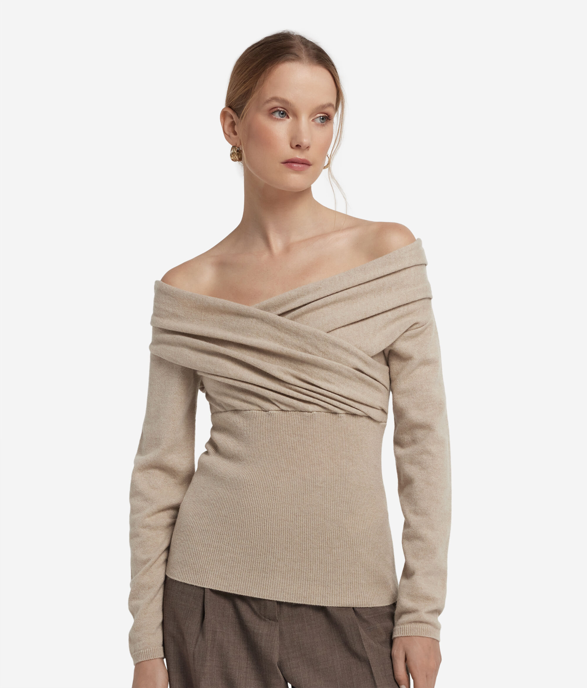 Soft and enveloping, this Ultrasoft Cashmere sweater hugs the figure with elegance and lightness. The draped crossover neckline gracefully reveals the shoulders, while the ribbed knit at the back and bottom enhances the silhouette. With a slim fit and a length that skims the hips, it is a garment that expresses femininity with delicacy, ideal for refined looks with personality.