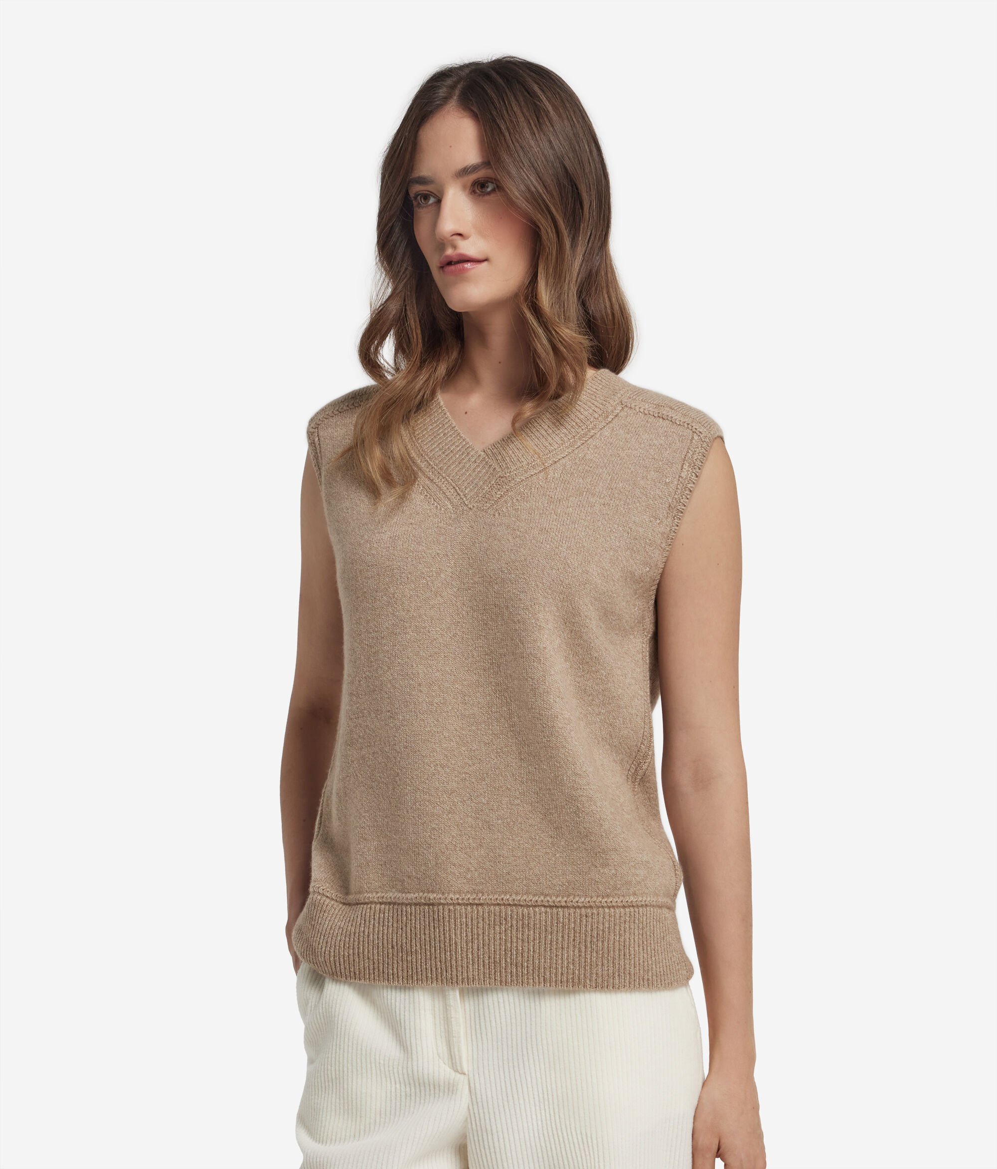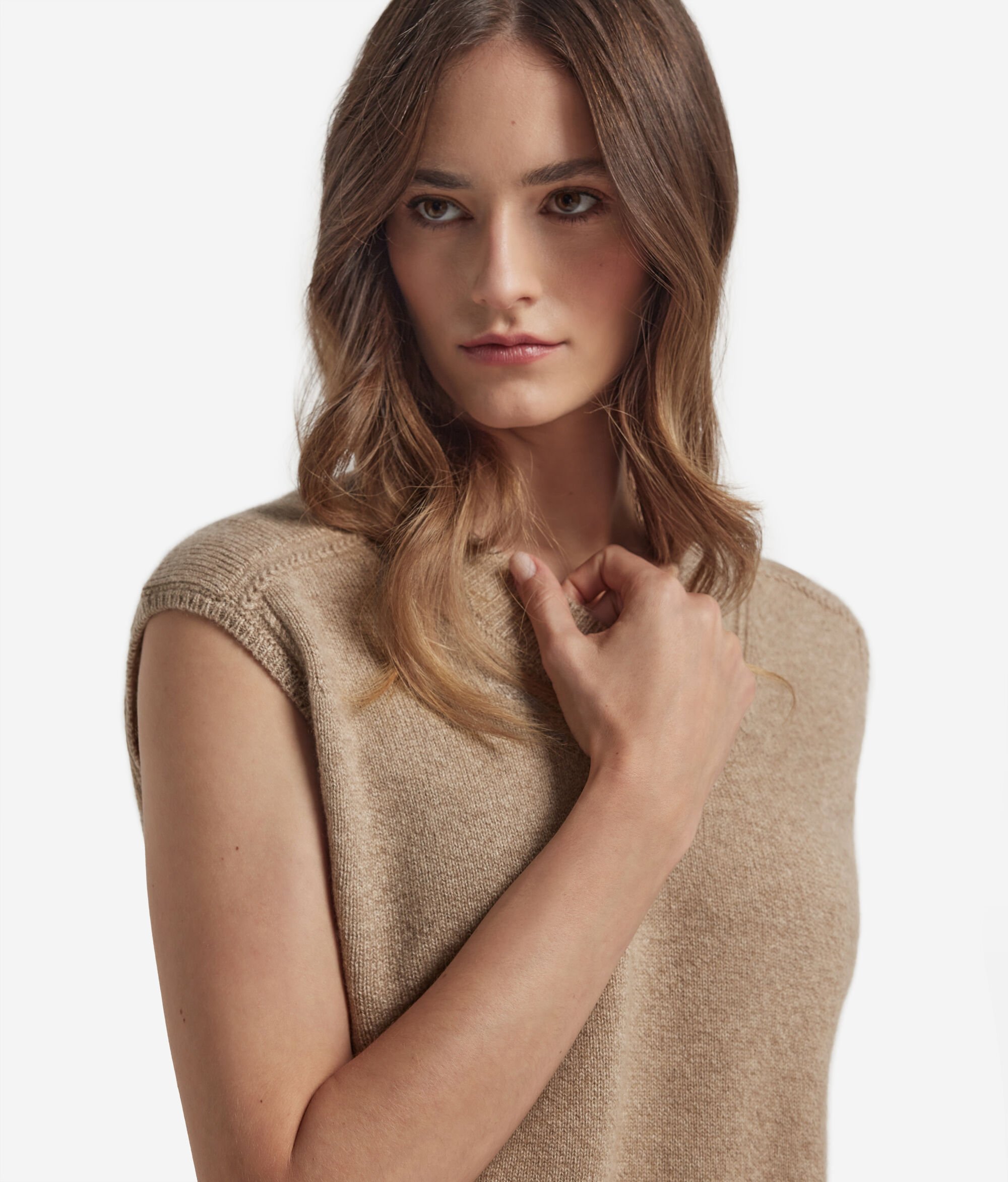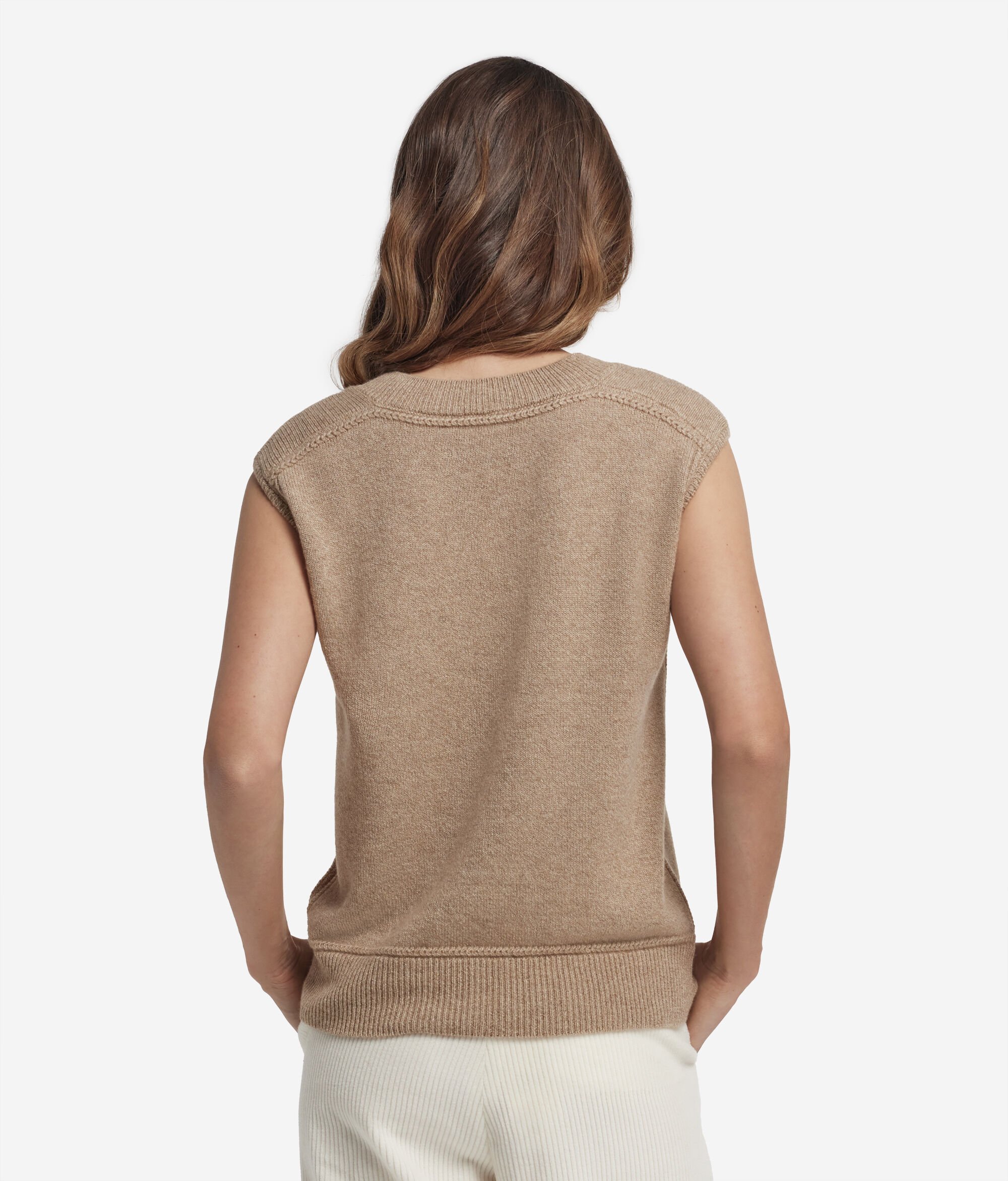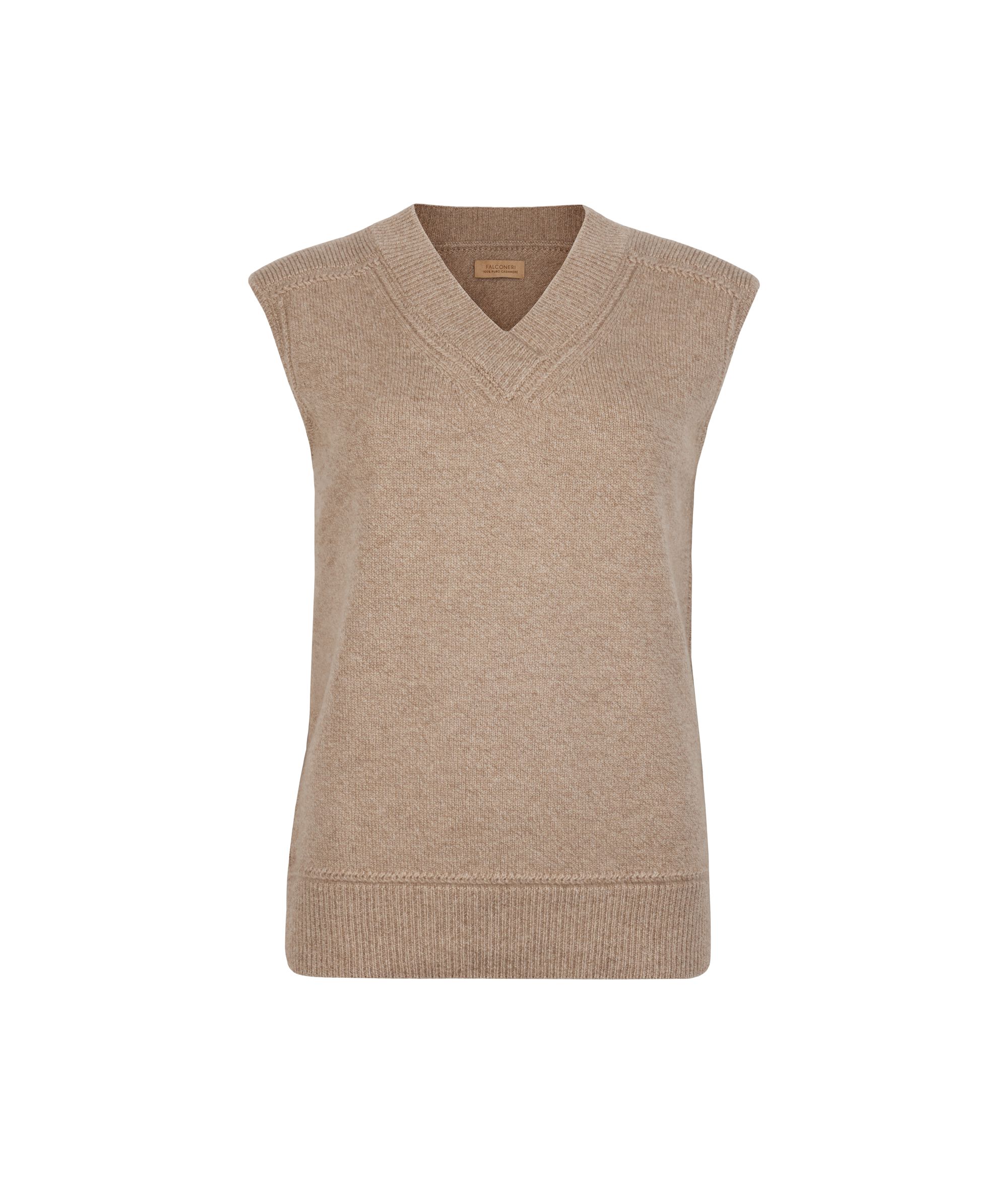 Made from pure Ultrasoft Undyed Cashmere, this vest celebrates the naturalness of the undyed fiber, enhancing its softness and discreet elegance. The V-neck and loose fit give the garment a relaxed yet refined attitude, perfect for any occasion. Cable knit trim on the neck, shoulders, and hem adds a touch of sophistication, while the ribbed trim finishes the design with subtle refinement.