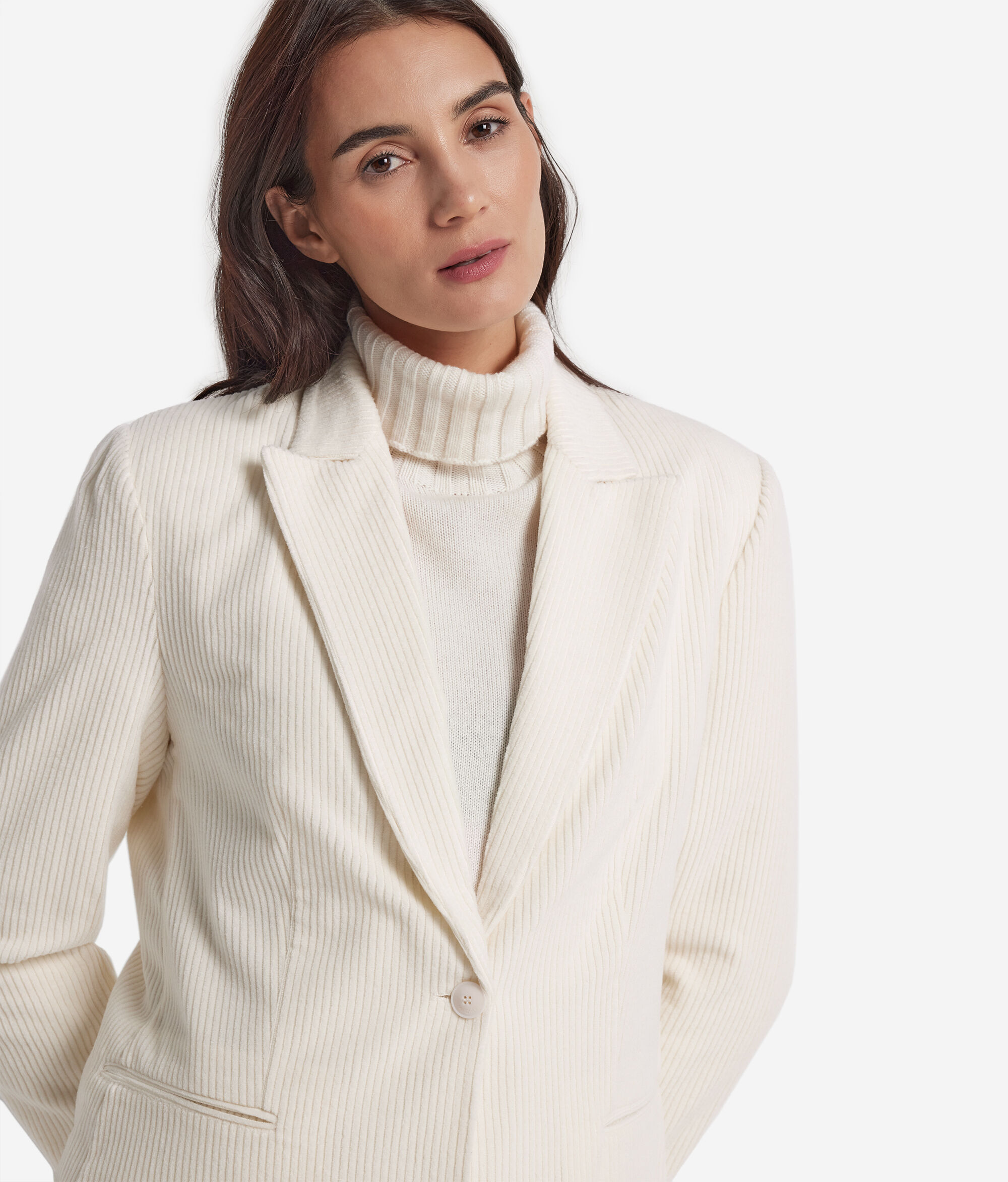 A piece that interprets tailored tradition with contemporary elegance. Made of wool and cashmere velvet, this jacket stands out for its soft, luminous texture, combining warmth and sophistication. The classic lapel and single-button closure create a clean, contemporary silhouette, while the welt pockets add an elegant, refined detail.