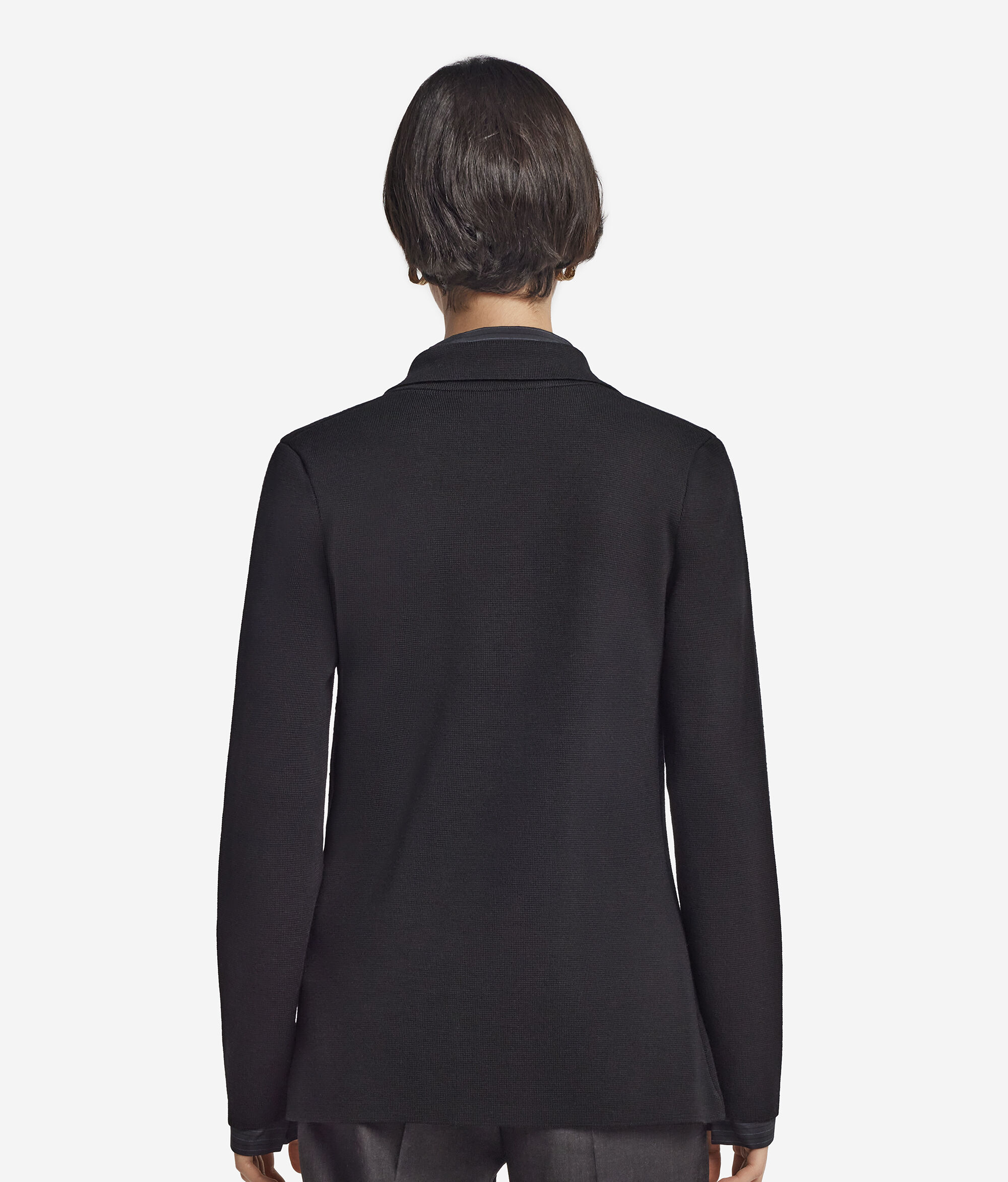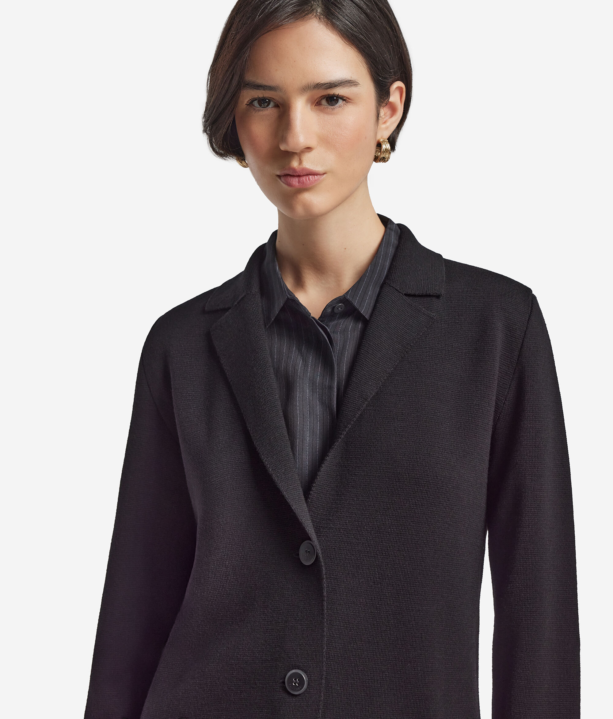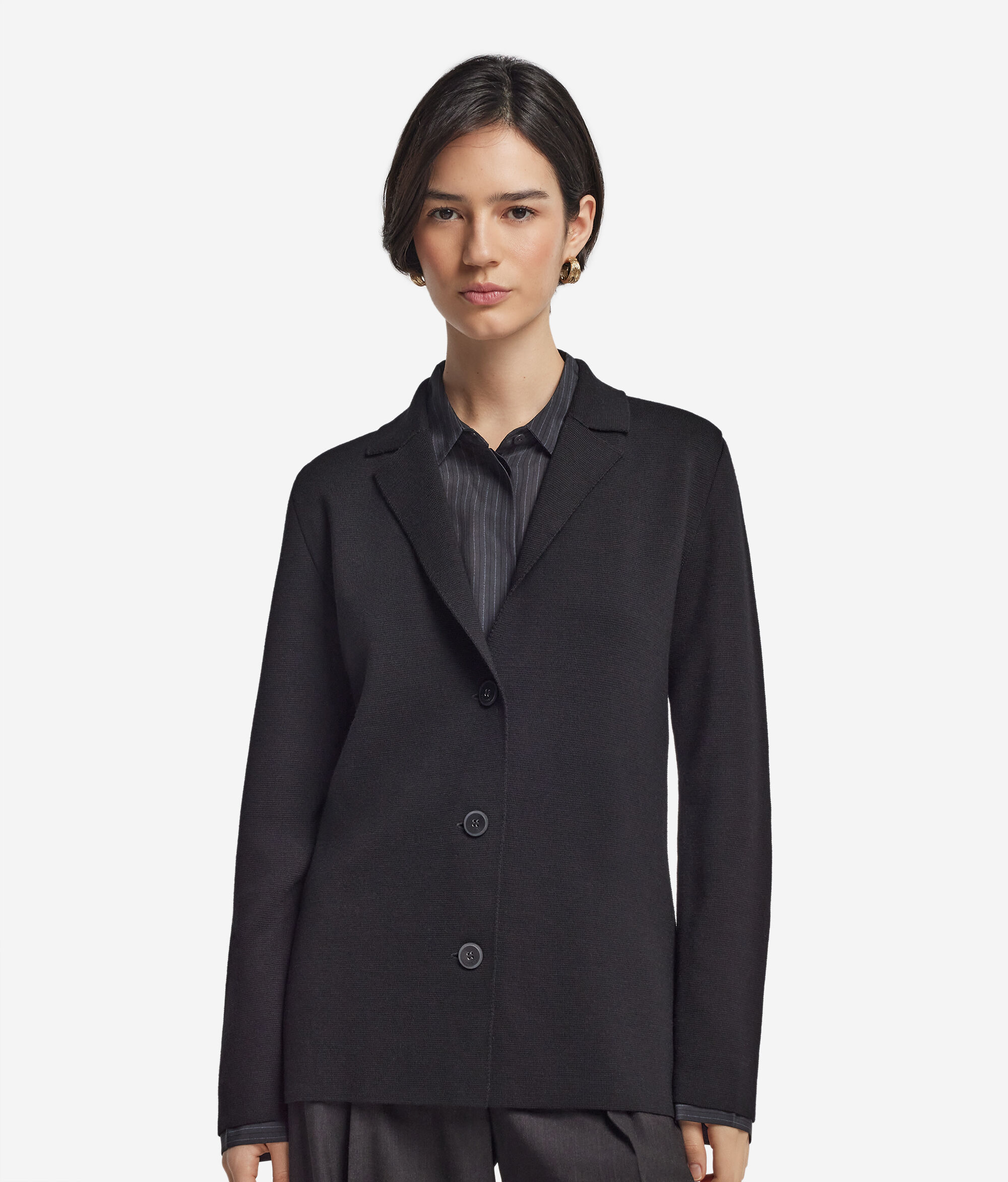 Enveloping and refined, this wool blazer is distinguished by its soft knit stitch workmanship. The delicate lapels and single-breasted placket lend timeless elegance, while the regular shoulders and flowing fit gracefully follow the movements. With a length at the hip, it is the ideal companion for looks that tell of style and lightness, between harmony and whispered femininity.