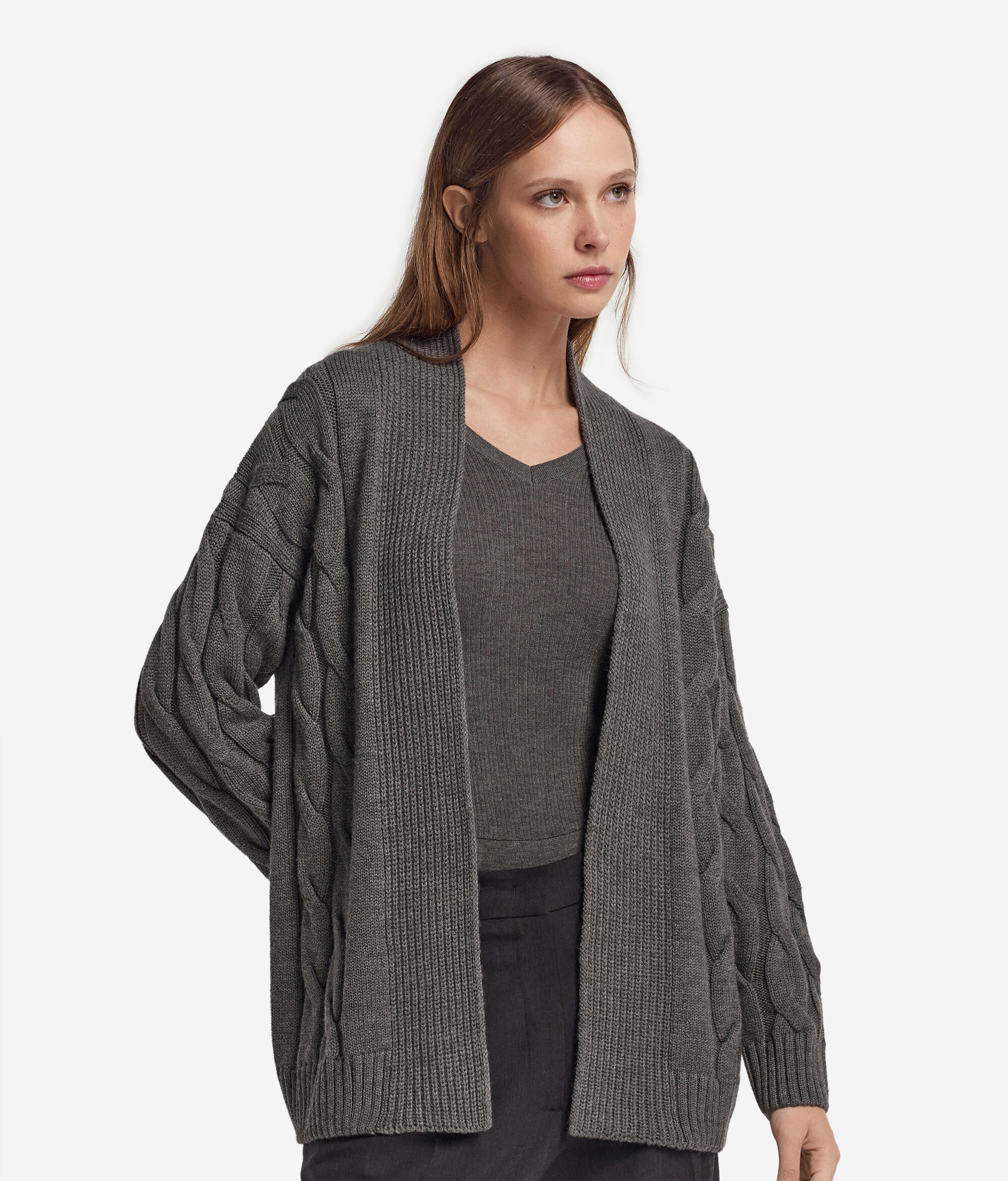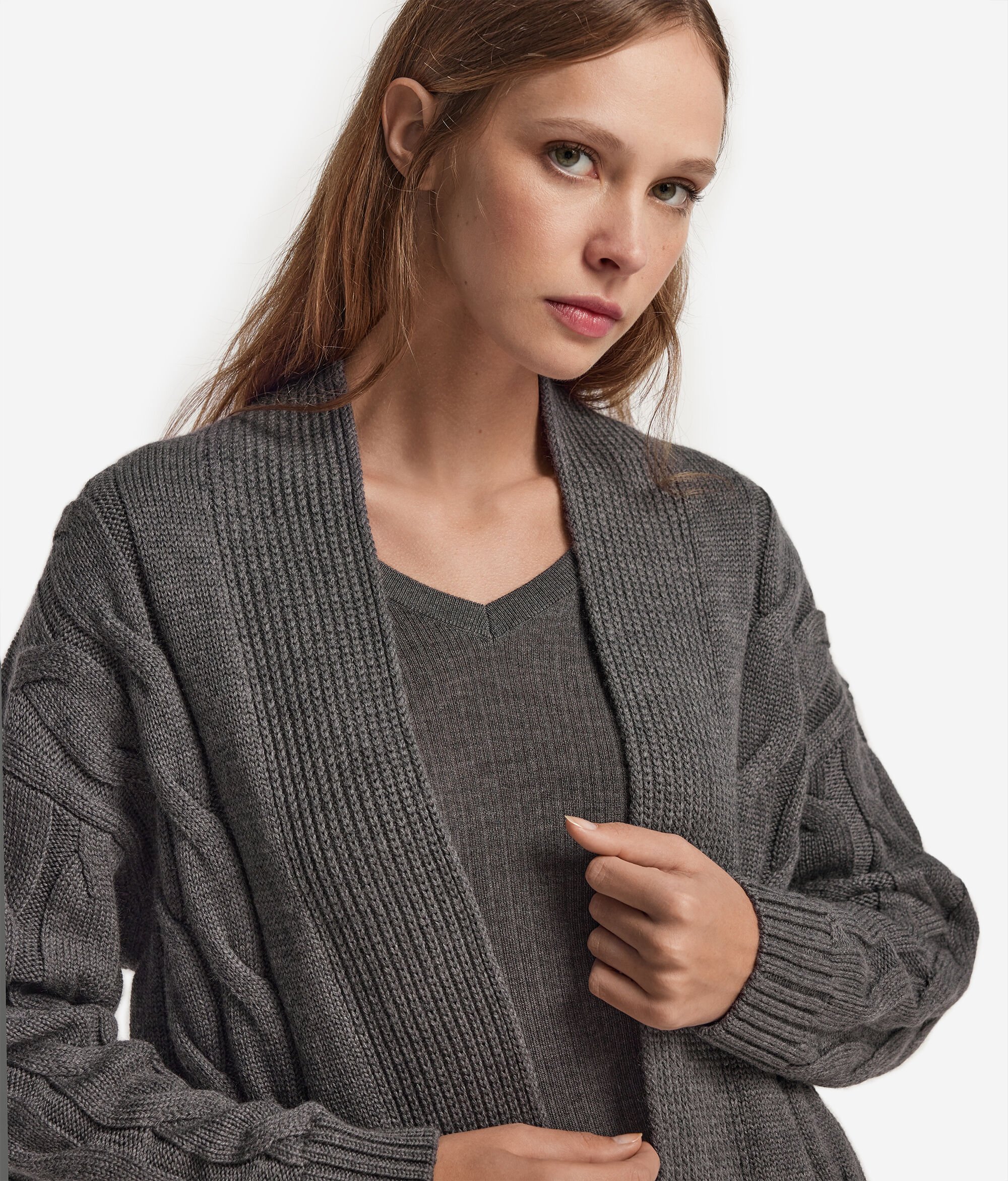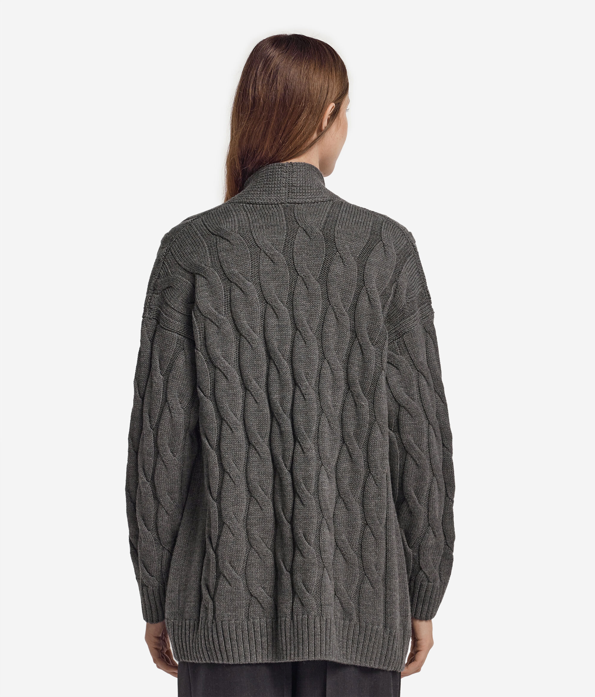 Crafted from soft wool, this relaxed-fit cardigan combines comfort and timeless elegance. The front opening with a turned-down collar enhances the silhouette, while the dropped shoulder provides it with a soft and enveloping allure. The vertical cable-knit workmanship, combined with the ribbed cuffs and hem, adds texture and tailored detail. The above the knee length makes it a versatile piece, perfect for completing each everyday look with character.