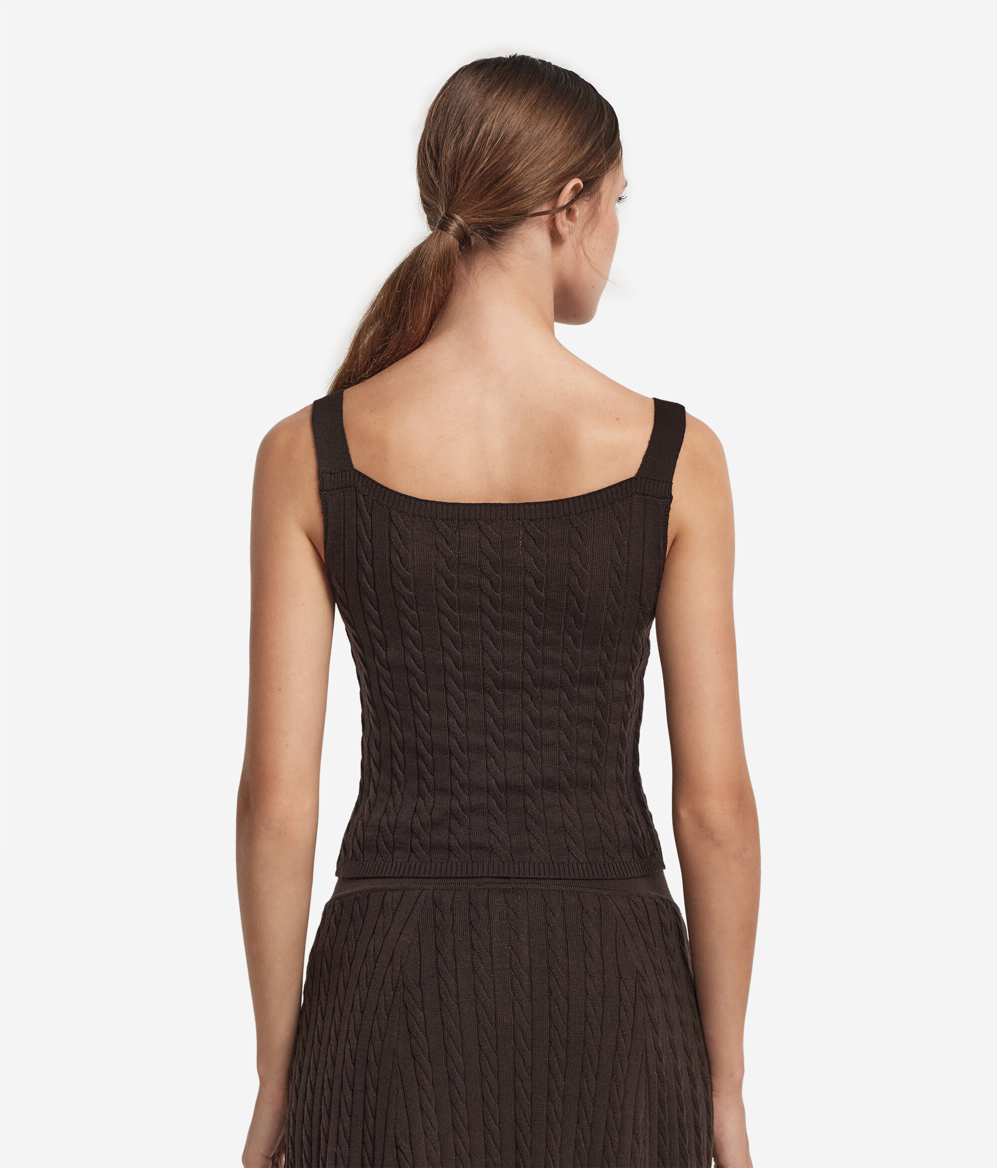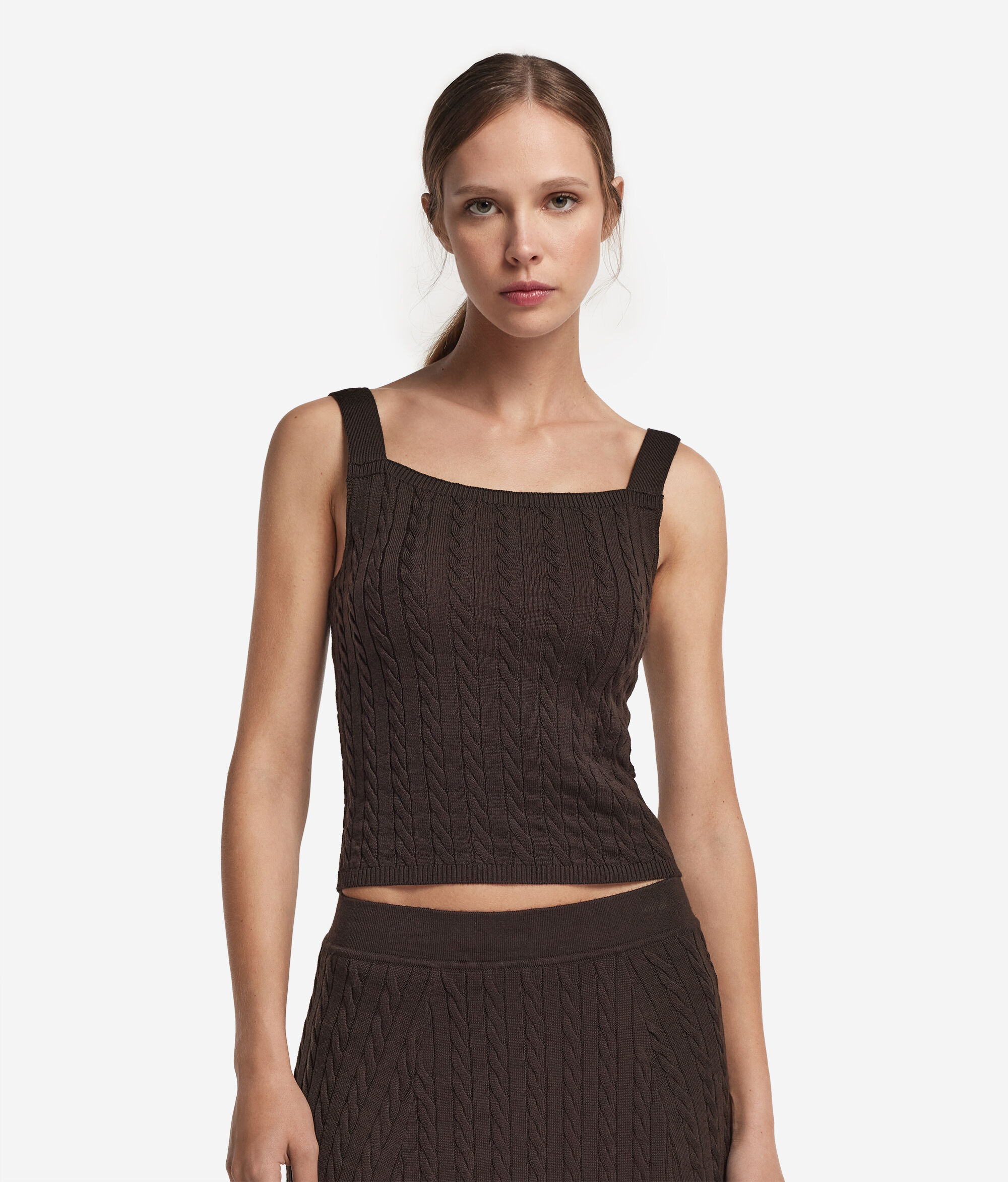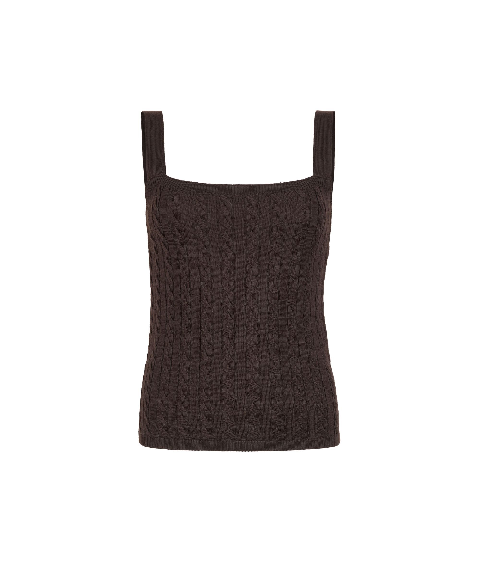 Featuring delicate vertical cable-knit workmanship, this wool top stands out for its essential design with wide shoulder straps and a straight neckline. The ribbed trimming adds character to the piece, while the slim fit naturally enhances the silhouette, making it a perfect piece to wear alone or under jackets and cardigans.