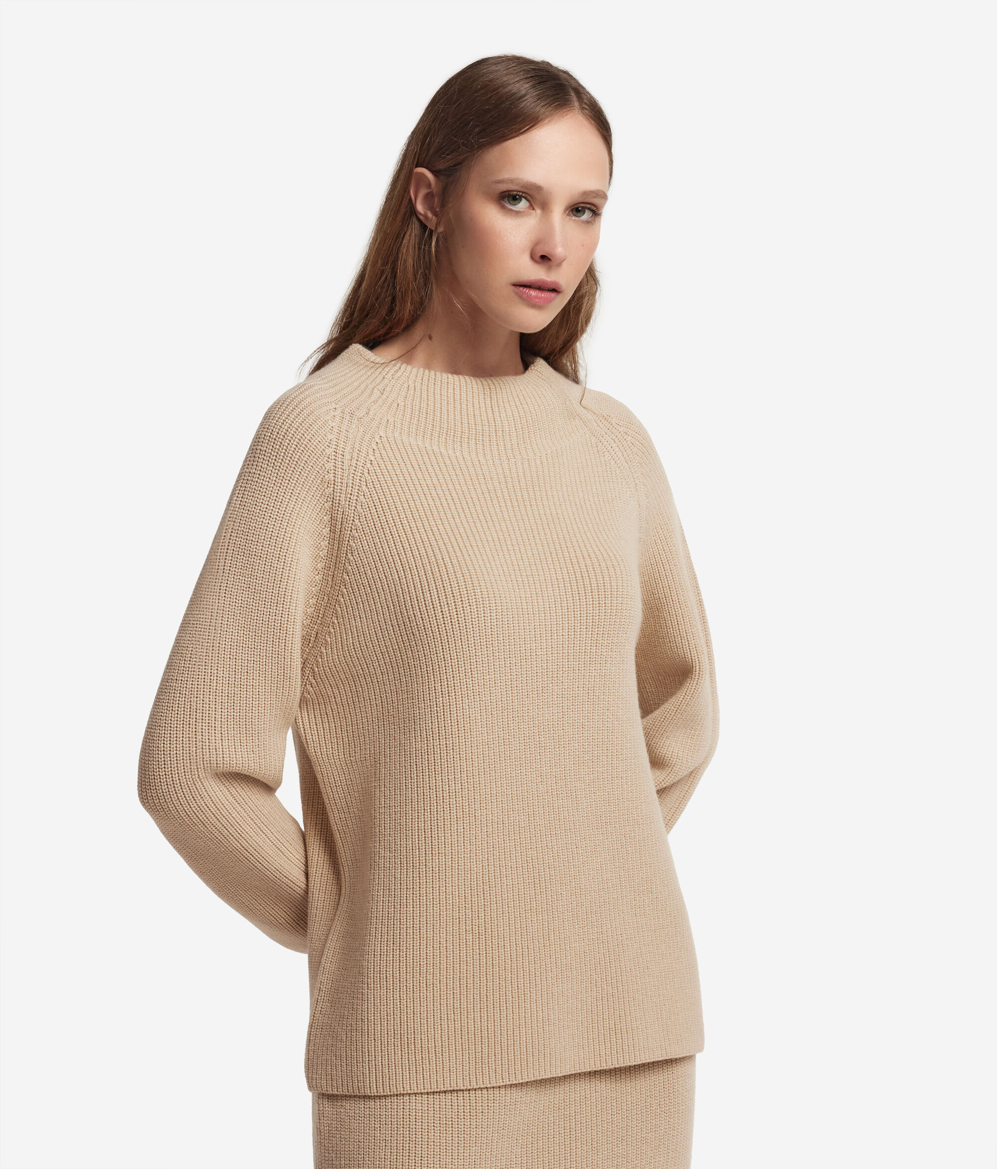 Elegant and refined, this wool turtleneck combines class and softness in a timeless piece. The turtleneck collar gently hugs the profile, while the ribbed knit workmanship, enhanced by the cuffs and hem, creates a texture that emphasizes the tailored character of the piece. The relaxed fit amplifies its versatility, making it a distinctive element of contemporary outfits with a measured and decisive style.